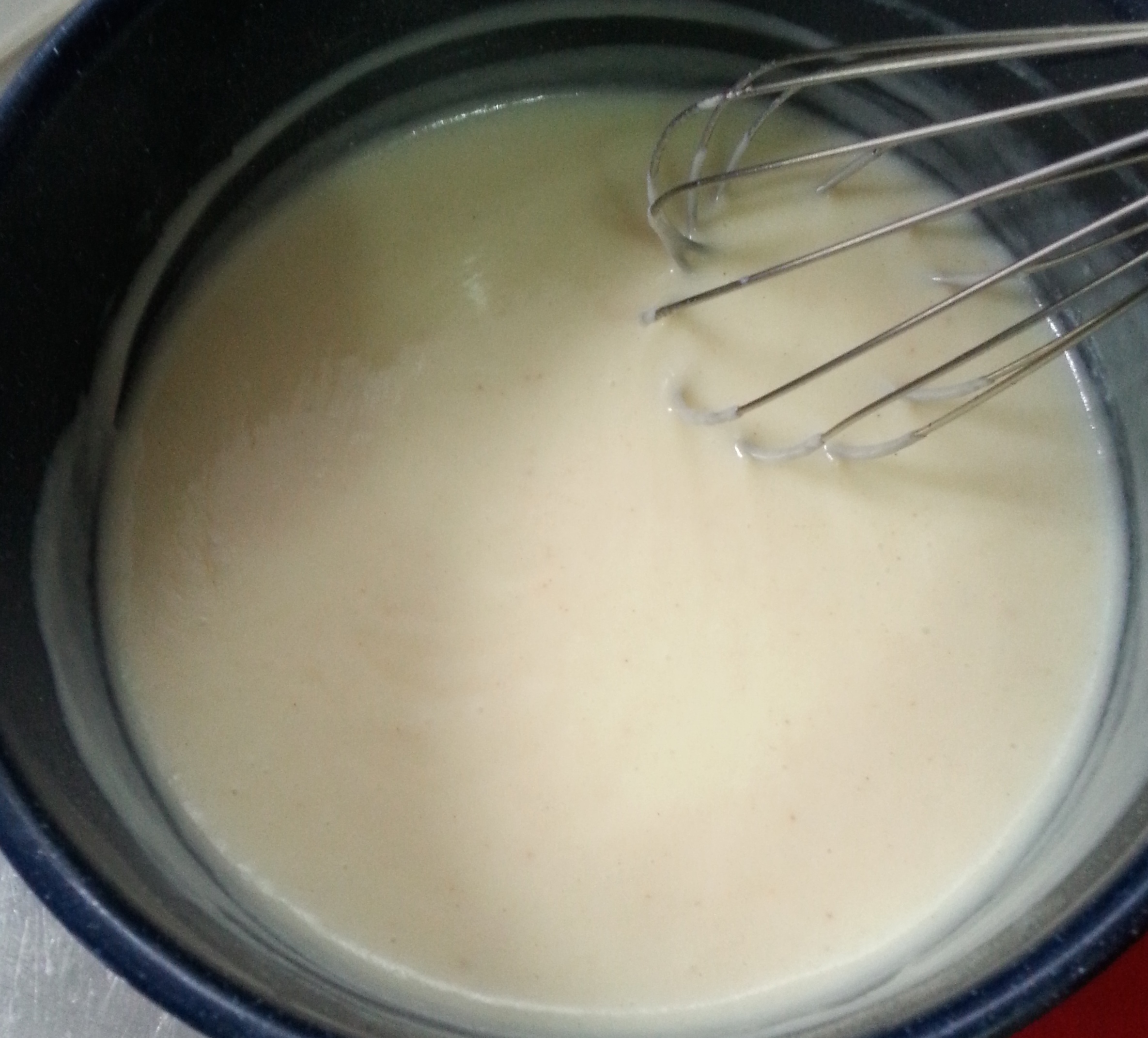Então acrescente aos poucos o leite, sempre mexendo com o fouet. Em seguida acrescente o sal, a noz-moscada e a mostarda dijon. Continue mexendo sem parar, em fogo baixo, por cerca de 5 à 8 minutos, até obter essa consistência (não deixe secar muito):