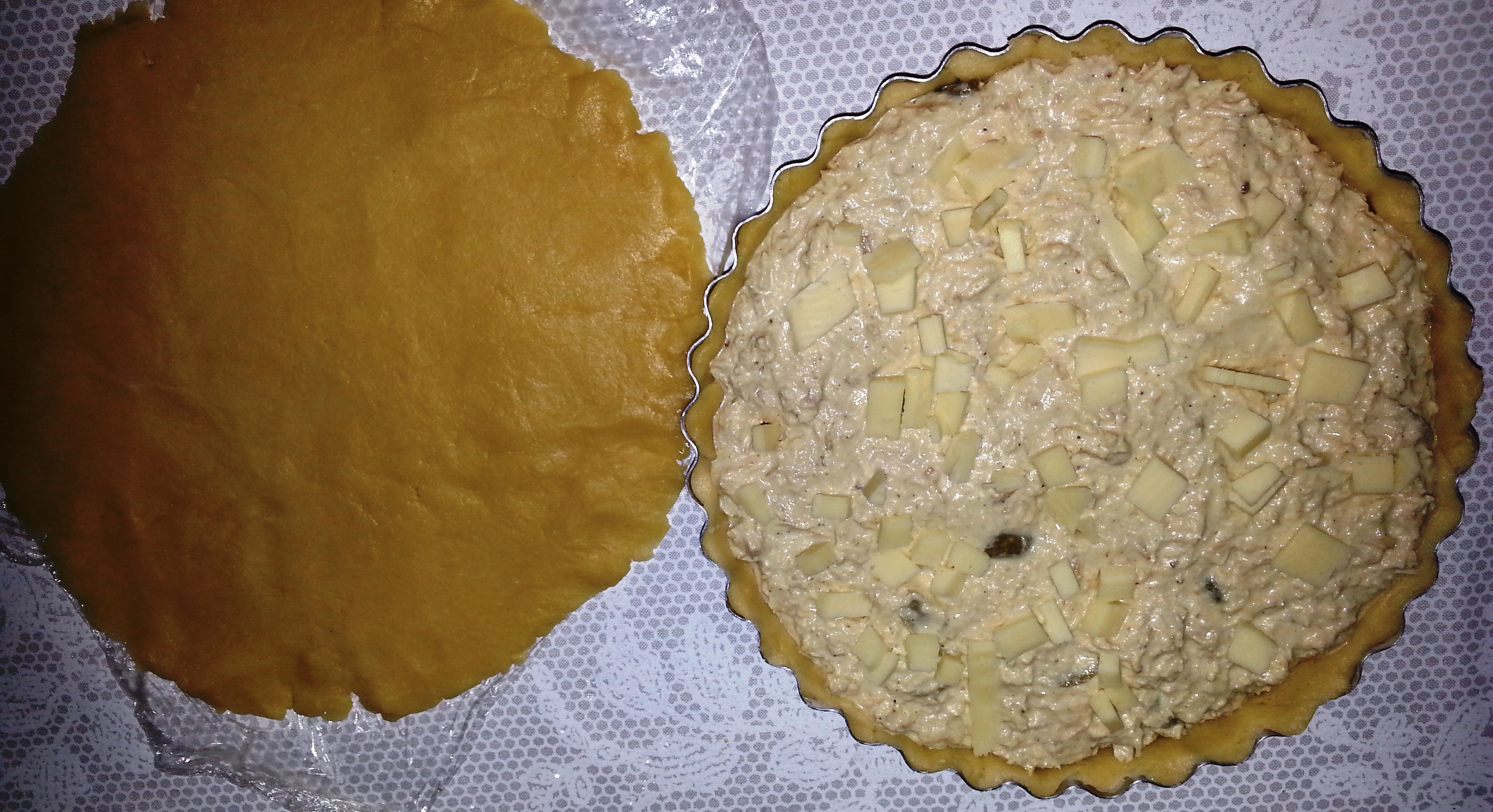 \Pré-aqueça o forno à 200 graus. Tire as duas partes da massa da geladeira. Abra uma das partes com um rolo (ou com a mãos) o suficiente para forrar uma fôrma de torta (de aproximadamente 25 cm de diâmetro). Forre então a fôrma untada (com manteiga e farinha de trigo). Coloque todo o recheio sobre a massa e por cima dele coloque a mussarela. Abra a outra parte da massa o suficiente para cobrir a torta/quiche e então cubra a forma, acertando os excesso de massa das extremidades.