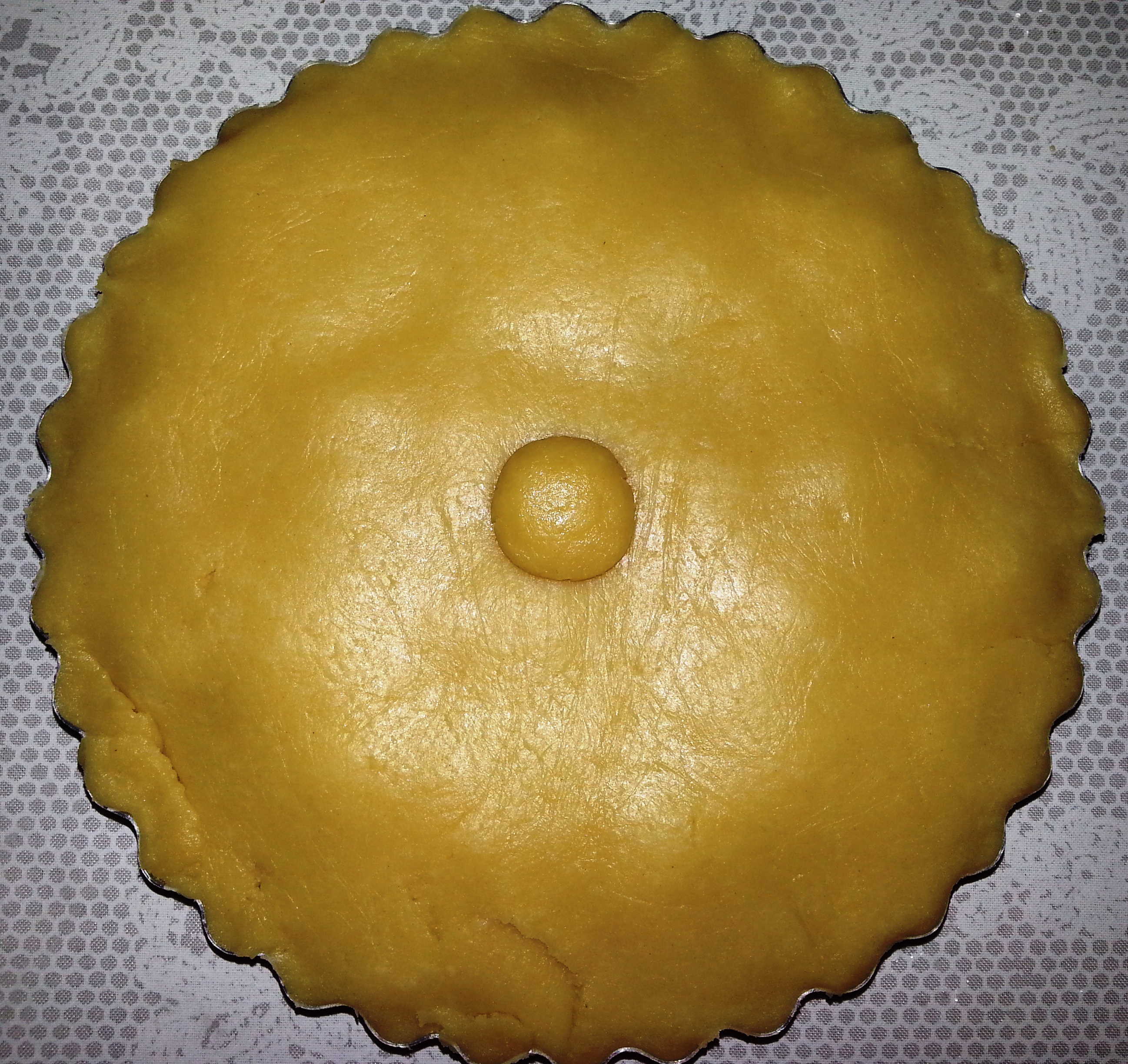 Acrescente então a farinha, as gemas e a água gelada. Misture tudo com as mãos, se a massa ficar muito quebradiça coloque mais colheres de água gelada. Após isso divida a massa em duas, faça duas bolas, coloque cada bola sobre um papel filme e cubra-a completamente com ele. Deixe então as duas partes descansar na geladeira por 1 hora.