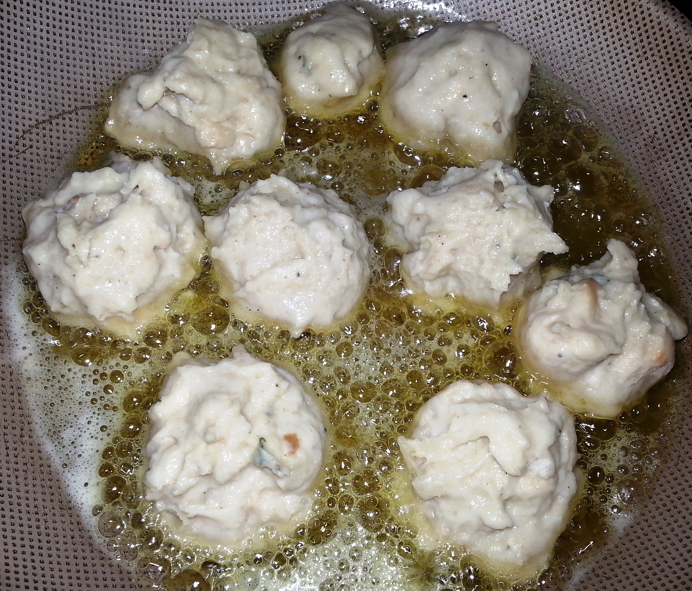 Ferva o leite e despeje sobre eles. Mexa para que todos os pedacinhos absorvam o leite por igual, então cubra com um pano e deixa descansar por 12 minutos. Em seguida tempere com a noz-moscada, pimenta-do-reino, sal e a salsa, misture um pouco. Acrescente o ovo, coloque 1 colher de farinha de trigo e mexa, então verifique a consistência (a mistura deve ficar úmida e só levemente pegajosa), se ainda estiver muito molhada acrescente mais 1 colher de farinha, e verifique de novo, se necessário acrescente mais 1 colher, até obter a consistência mencionada (olhe na foto em que elas estão fritando na frigideira para ter uma ideia melhor da consistência ideal). Molhe as mãos com água para a massa não grudar e modele as bolinhas (não precisa ficar bolinhas perfeitas!). Renderá de 12 à 14 bolinhas (menores que uma bola de golfe). Derreta a manteiga em uma frigideira e frite as bolinhas (elas douram rápido, cerca de 5 minutos). Vire para que doure todos os lados.