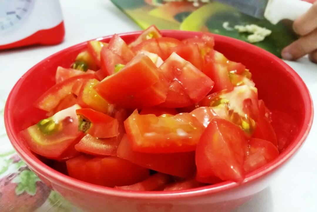 O Primeiro passo é cortar os tomates. Tire apenas a parte do cabinho do tomate, depois corte-os como você preferir (eu prefiro pedaços maiores).
