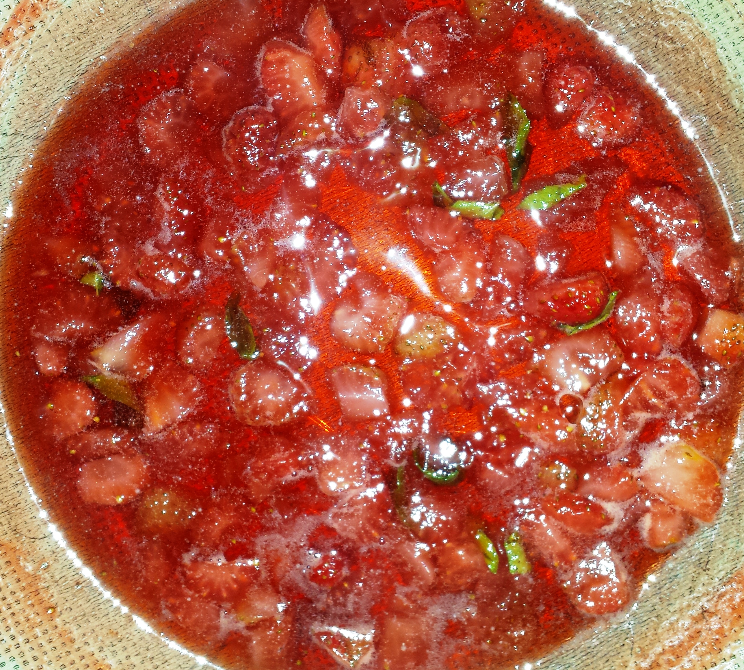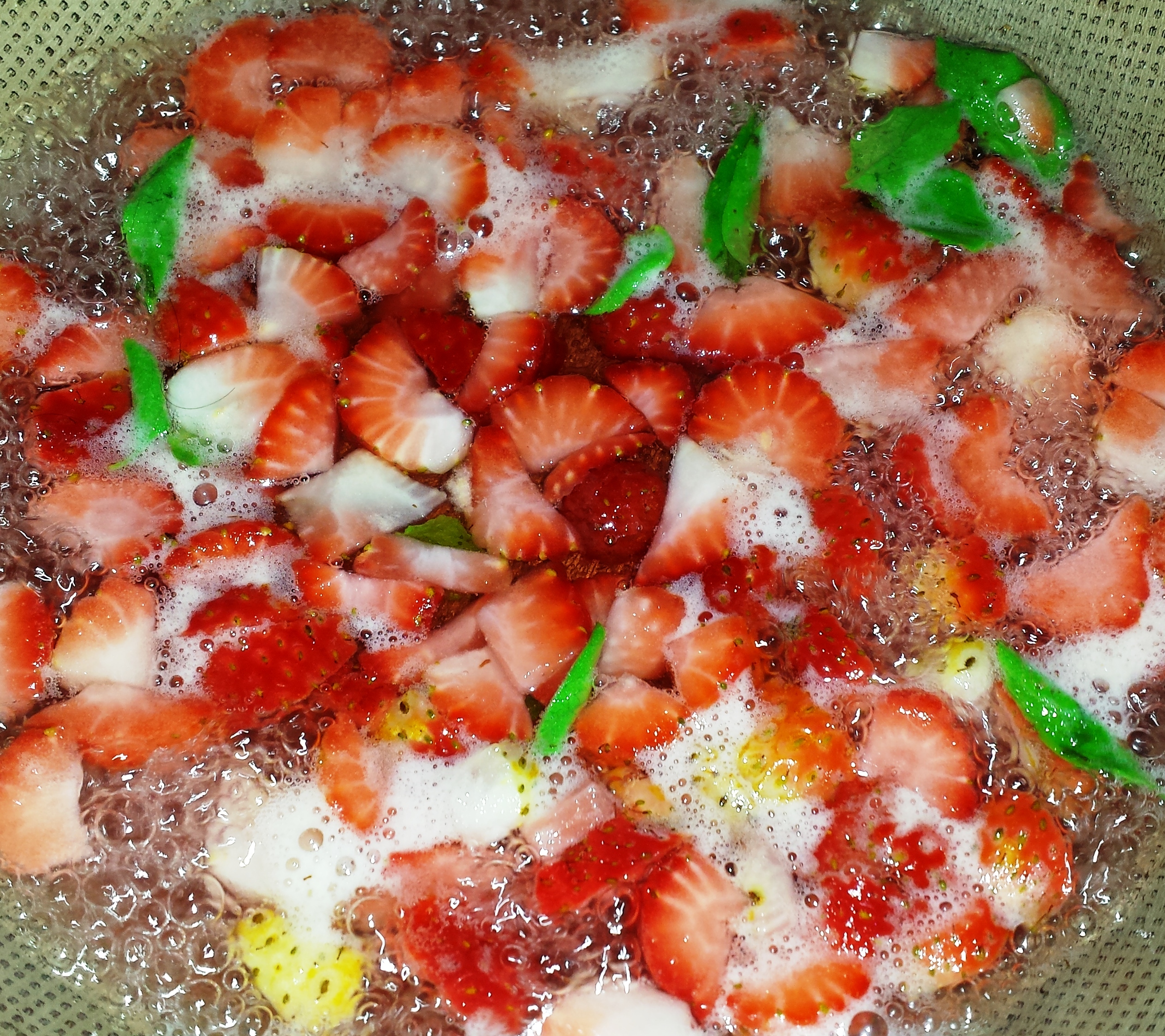 (As quantidades de ingredientes são relativas, siga essas quantidades aproximadas mas vá experimentando sua calda, se ver que quer mais liquida acrescente mais água, se não deixe reduzir mais, se quer mais doce coloque mais açúcar, etc. Coloque também a quantidade de manjericão conforme quer a presença dele – vá provando e deixe de seu gosto!).