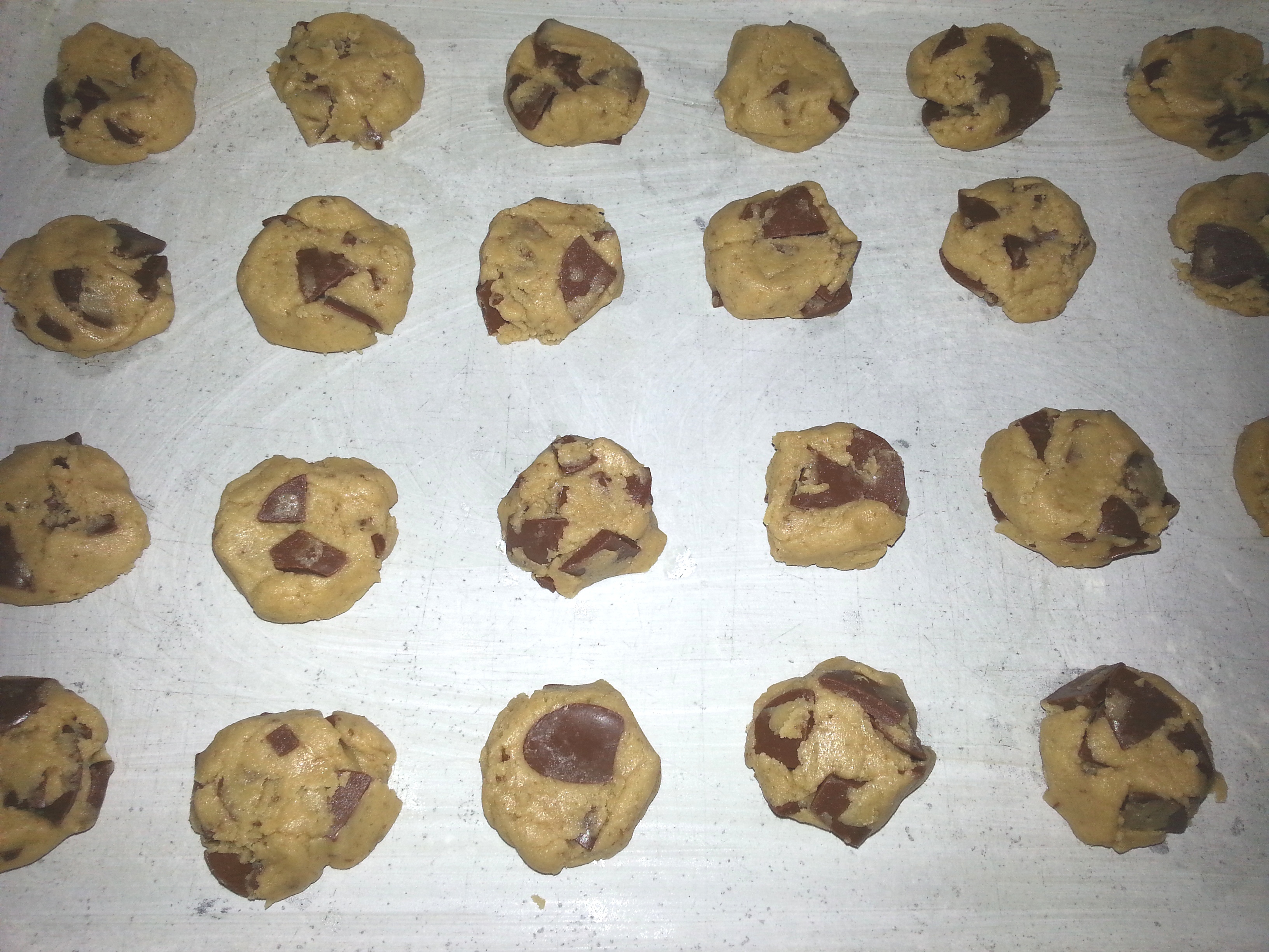 Unte a forma que irá usar para assar ou a forre com papel manteiga, e então vá fazendo bolinhas com a ajuda de uma colher e colocando na forma (deixe um espaço de uma polegada entre um e outro na forma – eles crescem um pouco, se fizer eles maiores deixem 2 ou mais polegadas de distância). Depois que por a bolinha na forma de uma achatadinha nela com a colher, para que eles fiquem em formatos bonitinhos de cookie: