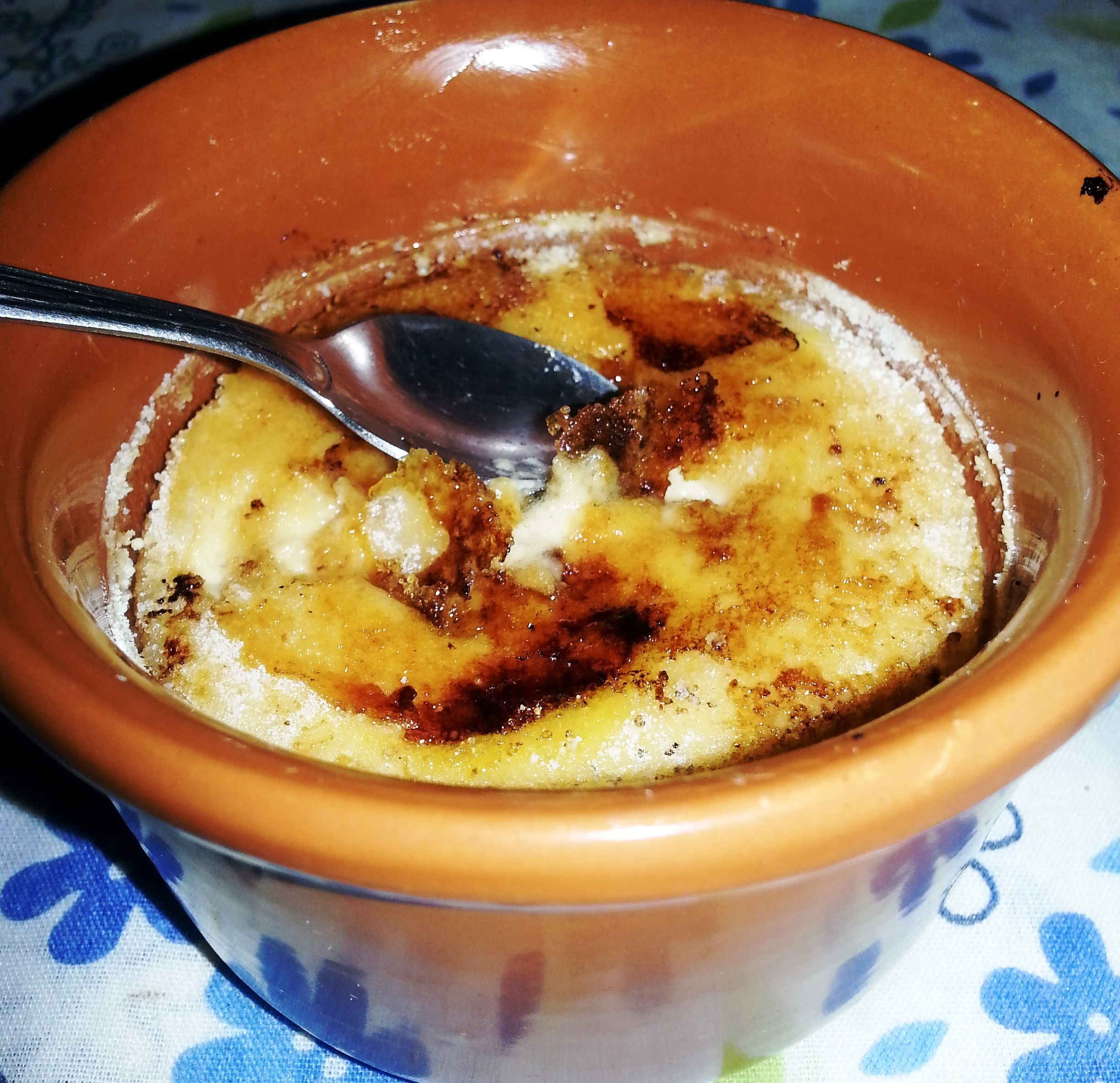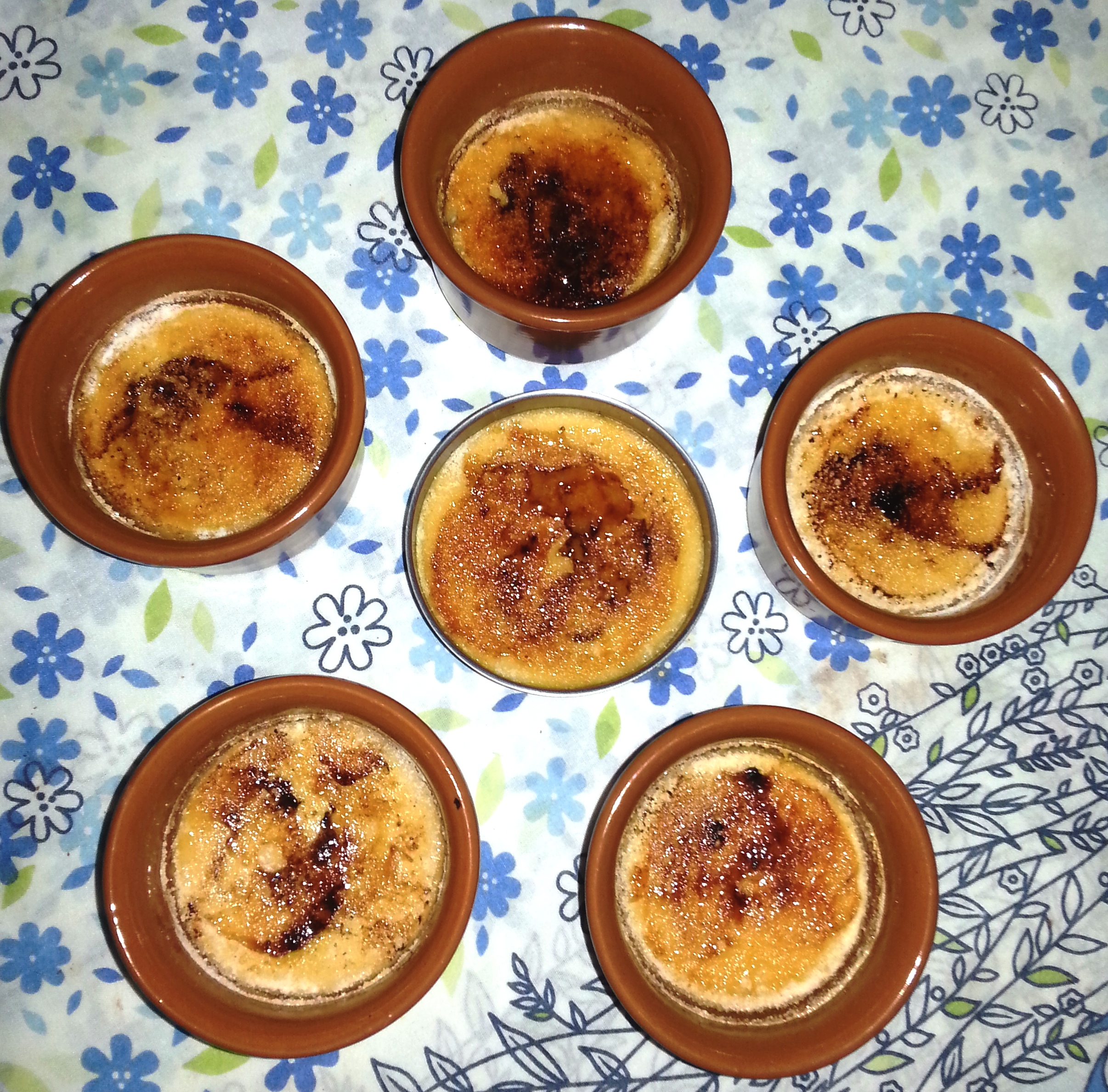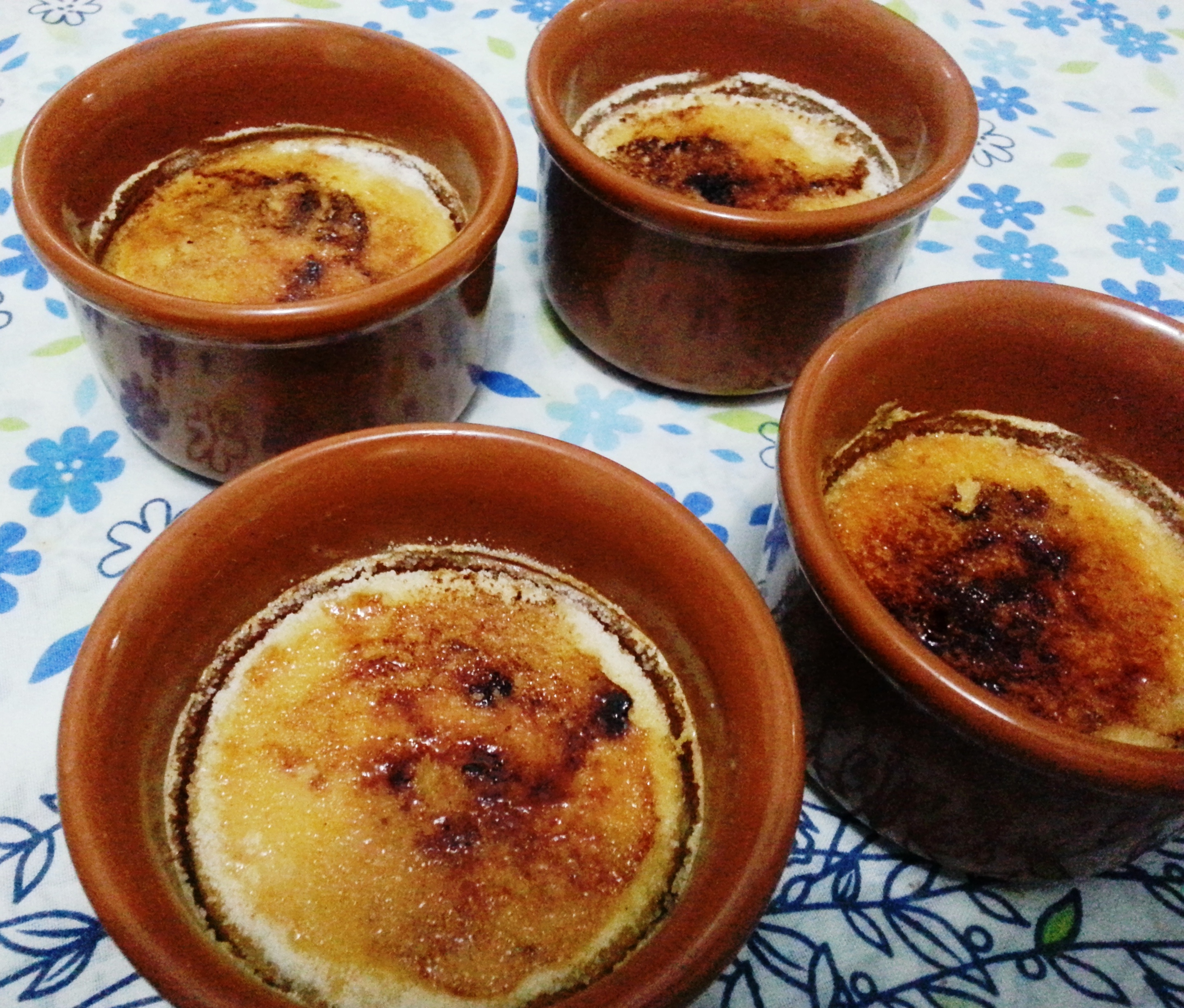 Após assar, retire do forno e deixe esfriar em temperatura ambiente. Então cubra-os com papel filme e leve para a geladeira por 3 à 4 horas, ou por uma noite. Na hora de servir vem a parte mais legal: Fazer aquela casquinha linda por cima! Retire-os da geladeira e tire o papel filme, se a superfície estiver úmida seque com um papel toalha delicadamente. Então polvilhe uma camada de açúcar por cima (não muito grossa), e aí é só caramelizar esse açúcar, e você tem duas opções para fazer isso: Pode usar um maçarico culinário (mais prático e com resultados melhores), ou usar uma colher de ferro aquecida. Se usar o maçarico é só ir fazendo com ele movimentos circulares até “queimar” o açúcar e deixar ele no tom das imagens abaixo (sem queimar muito para não ficar amargo, tem que ficar bronzeadinho só, 10 segundos de maçarico em cada um é suficiente). Se for usar uma colher de metal faça da seguinte forma: Esquente ela na chama do seu fogão a gás até que ela esquente bastante (o metal ficará num tom azul e meio escurecido). Após aquecer encoste a colher no açúcar e faça movimentos circulares, até caramelizar toda a superfície. Antes de aquecer a colher novamente lave-a muito bem para não ficar resíduos.