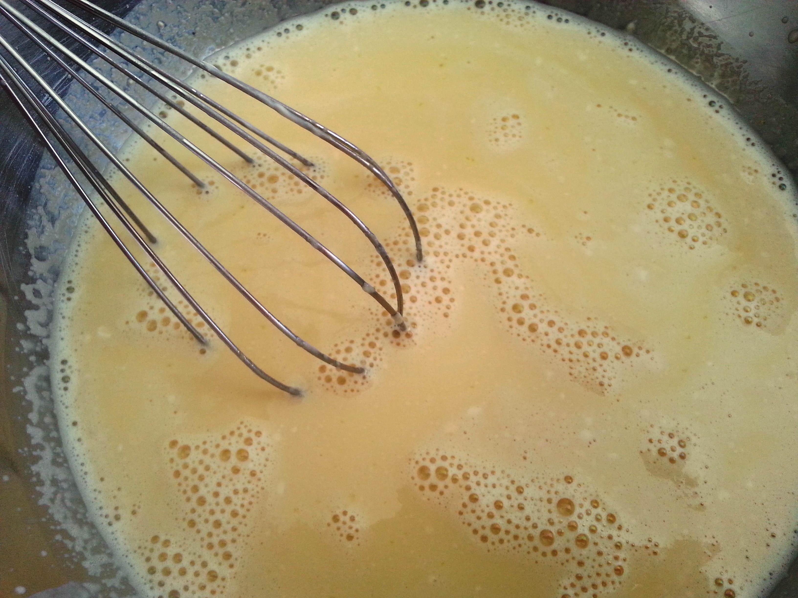 Então vá acrescentando aos poucos o creme quente que estava reservado, batendo sempre, mas não demais nem muito rápido para não criar muitas bolhas (mas não se preocupe, algumas são normais criar).