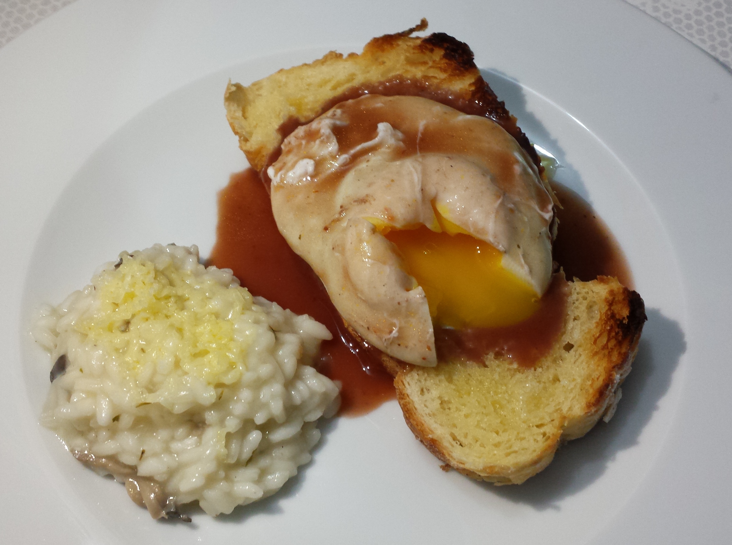 Ovo poché com molho de vinho tinto (Oeufs en meurette) sob uma torrada, com risoto funghi. O risoto talvez fosse dispensável nesse prato, mas meu desejo era esses aromas todos juntos. Nossos desejos às vezes não são catalogados ou conhecidos, são estranhamente não compreendidos ou aceitos, ao mesmo passo que são lindos e autênticos. A cozinha expressa a possibilidade de realizar-se, de simbolicamente dizer em um prato o que queremos dizer em um mundo. Nos links abaixo você encontra a receita completa desse menu, em sua intuição você encontra o caminho para seus desejos autênticos, próprios.