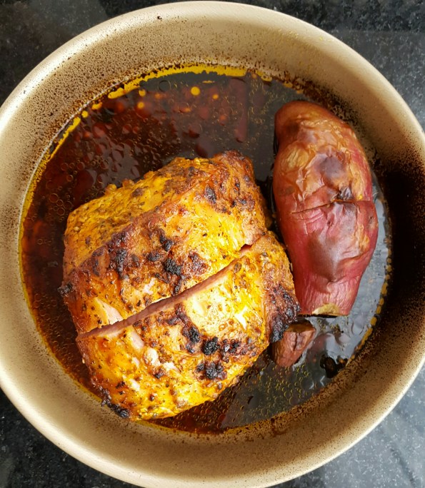 Essa é minha picanha suína temperada com: Alho, sal, pimenta-do-reino preta, pimenta rosa, pimenta calabresa, um pouco de páprica picante e um pouco da doce, azeite de oliva, limão, ervas secas (orégano, salsa, louro), um pouquinho de mostarda dijon e noz-moscada. As quantidades dependem do tanto que quer presente cada ingrediente – use seu gosto e história para temperar e erquilibrar. Ao usar 3 tipos de pimentas equilibre para não pesar. Depois de temperar deixe pelo menos 2 horas pegando gosto antes de assar (melhor uma noite). Eu assei com uma batata doce – que adocica muito bem a carne de porco.