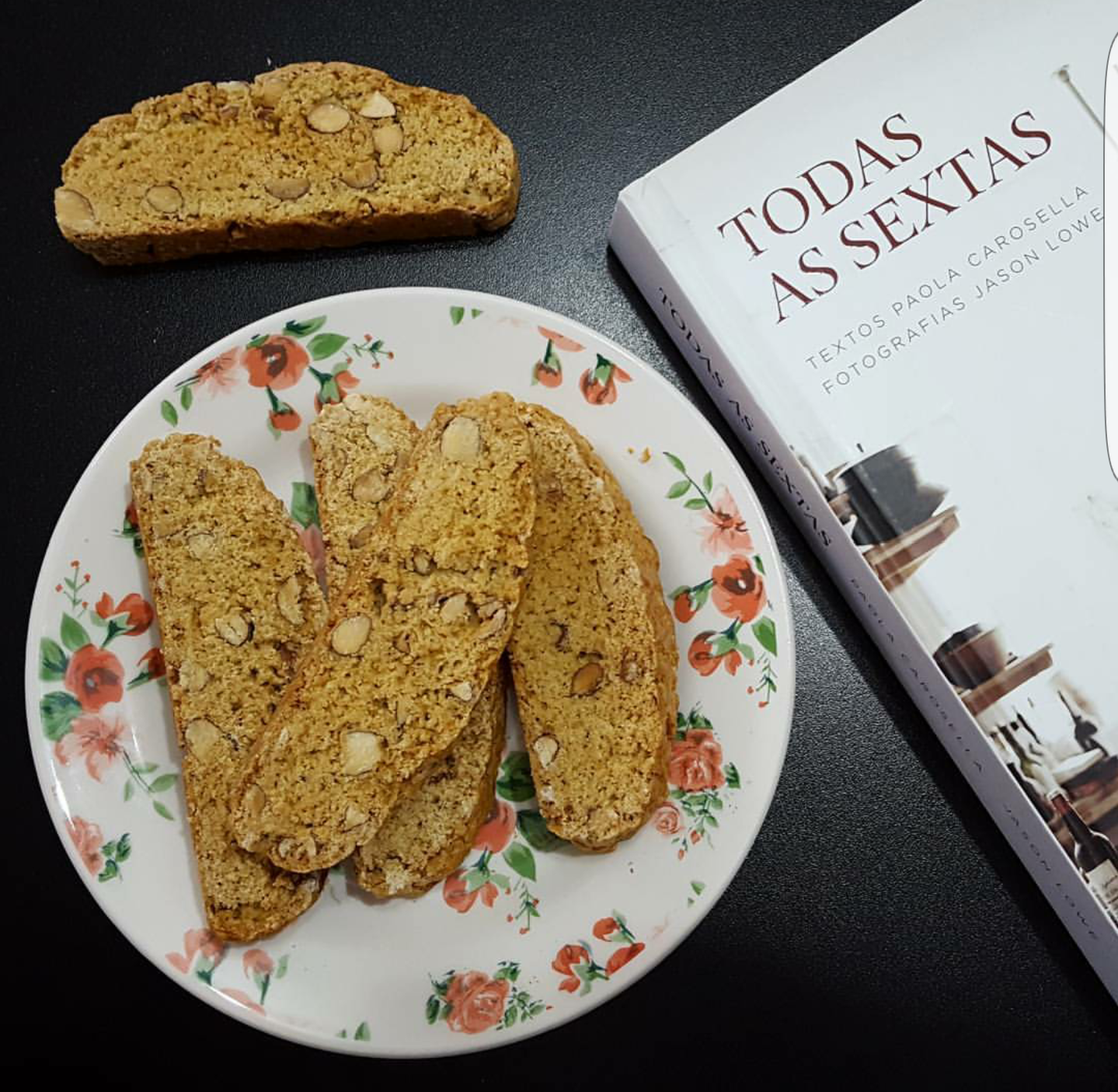 Sexta-feira, dia do projeto “Gratidão de todas as sextas” – Cozinhar todas as 94 receitas do livro “Todas as sextas”, de @paolacarosella (Esse projeto tem um porque, clique aqui e leia o post que publiquei dia 11/11/16, explico lá tudo com todo meu coração). Receita 18/94: Biscotti. Que coisa linda, crocante e amorosa. Chove tanto em São Paulo esses dias. Minha sobrinha de 6 anos está de férias aqui em casa. Ela adora me ajudar na cozinha. Queriamos algum biscoito para o café da tarde ao som da chuva, resolvi então contar pra ela a história de um biscoito, para que ela compreendesse que eles não nascem nas prateleiras do mercado, e que podemos fazê-los com nossas mãos. E fizemos. Segundo Ana, minha sobrinha, cortar as amêndoas do biscotti com muito cuidado e amor era muito importante. Assim fizemos. Ela olhava com algum tipo de olhar fascinado o ovo se misturando na farinha, virando massa. Ela gosta dessa parte, e de ter a mão dela no meio disso. Ana aprendeu que o biscoito é a união de muitas coisas, que vem de muitos lugares – das plantas, das galinhas, do trabalho de pessoas. Ana também aprendeu o que a mão dela pode criar, e também o tempo que as coisas às vezes levam – ao invés de em 10 minutos ir no mercado e comprar biscoito, levamos 2 horas cortando, amassando, moldando, assando, esperando. Ela achou bom esperar. Foi uma tarde lenta, e o biscotti ensinou muitas coisas pra Ana. Ela deve ter sentido gratidão, e hoje nós dois agradecemos Paola juntos – ainda com o gosto lindo do biscotti na boca (são durinhos, crocantes, com um tom de erva-doce que abraça a gente, que mágico). Com café é inspirador.