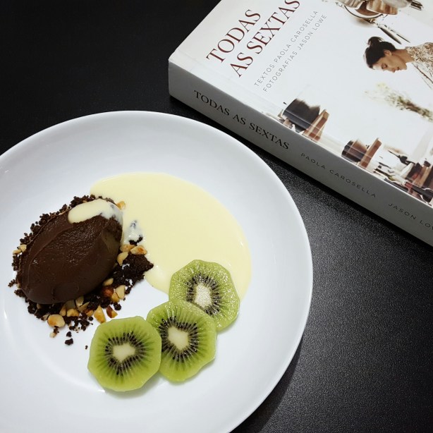 Sexta-feira, dia do projeto “Gratidão de todas as sextas” – Cozinhar todas as 94 receitas do livro “Todas as sextas”, de @paolacarosella (Esse projeto tem um porque, clique aqui e leia o post que publiquei dia 11/11/16, explico lá tudo com todo meu coração). Receita 21/94: Cremoso de chocolate com migalhas de cacau e creme inglês. Acho que estou descobrindo lentamente porque creme inglês é tão importante. Ele muda as coisas de um jeito generoso – neutraliza algo para melhor experimentarmos a essência genuína do doce que acompanha. Ele é gentil, fornece espaço para outro brilhar. Alguns doces não seriam tão bons sem ele. Deviamos aprender algo com o creme inglês – tanto com sua generosidade (que da espaço para outros brilharem, sem cobrar nada) quanto com sua capacidade de proporcionar um estado neutro, que tira excessos e com leveza nos faz melhor compreender a verdade de uma coisa. Não sei se está tão claro tudo isso, porque estou falando de uma experiência sensorial com esse prato que me emociona e me lança em algo além. Quando o prato acabar uma coisa bem bonita vai ficar. O cremoso ficou incrível, a farofa de avelãs e cacau também, a fruta suculenta estava plena. Mas o creme inglês fez todo esse conjunto ficar emocionante. Paola me deu uma receita de emoção hoje. Um prato simboliza nossa posição na vida. Estou emocionado e feliz, e queria agradecer. Isso está muito gostoso.
