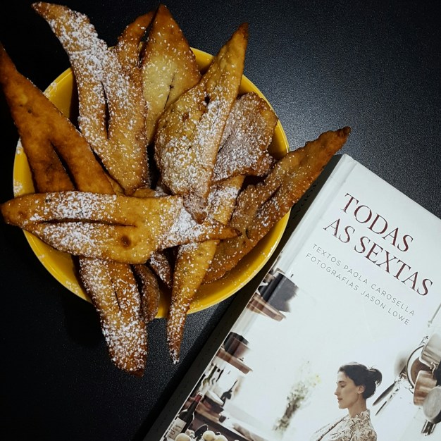 Sexta-feira, dia do projeto “Gratidão de todas as sextas” – Cozinhar todas as 94 receitas do livro “Todas as sextas”, de @paolacarosella (Esse projeto tem um porque, clique aqui e leia o post que publiquei dia 11/11/16, explico lá tudo com todo meu coração). Receita 28/94: Chiaccere. Não postei ontem porque não consegui parar um momento para escrever como tem que ser escrito esses posts: com tempo e espaço suficiente para poder pensar e dizer de verdade sobre o afeto e marca de fazer a receita. Ontem o dia estava cheio de pessoas, algumas delas estavam aqui em casa e compartilharam comigo o chiaccere – ele é realmente muito bonito de compartilhar – Primeiro compartilhei o tempo que gastei para fazê-los com as pessoas queridas que estavam comigo na cozinha. Depois compartilhamos o chiaccere juntos, com conversas em volta da mesa, com café, chá, risadas, desabafos e perguntas sobre as coisas engraçadas e difíceis da vida. Então o chiaccere acabou, mas ficaram as memórias de uma tarde compartilhada, vivida junto, que teve marcas valiosas, que tem junto delas o gosto do chiaccere. Cozinhar no meio de laços, com tempo e partilha é assim, marcante e significativo. Crocante e com o perfume da erva-doce e das raspas de limão. Simples, tão simples de fazer e me deu tanto de presente – porque tardes como essa não tem preço. Agradeço o chiaccere, o tempo que ele tomou e as pessoas que tive ao meu lado que ele foi uma desculpa para unir e gastar tempo junto.