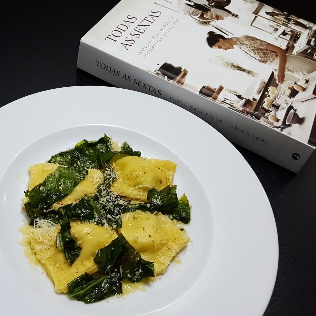 Sexta-feira, dia do projeto “Gratidão de todas as sextas” – Cozinhar todas as 94 receitas do livro “Todas as sextas”, de @paolacarosella (Esse projeto tem um porque, clique aqui e leia o post que publiquei dia 11/11/16, explico lá tudo com todo meu coração). Receita 35/94: Massa branca para pasta. Receita 36/94: Ravióli de abobrinhas. Fazer massa fresca em casa sempre será pra mim revolucionário, corajoso e marcante. Ir atrás de ingredientes dignos, separar, amassar, esperar descansar, abrir, cortar, montar e cozinhar – Executar com suas mãos todos esses verbos e usar seu tempo para construir essa experiência artesanal e mágica, ao invés de comprar pronto no mercado e pular toda essa parte, é de fato revolucionário, hoje em dia. Dizem que tempo é dinheiro, mas como li outro dia e me emocionei lendo: “Isso é uma monstruosidade, o tempo não é dinheiro, o tempo é o tecido de nossas vidas”. Fazer massa fresca em casa é ter uma experiência diferente de tempo, de pensar sobre o tempo e o que temos feitos com o nosso (Que marcas costuro no tecido da minha vida?). Se tem um conselho que eu possa te dar é: Tire um dia de folga, antes de morrer, e faça massa fresca em casa. Isso movimenta algo na gente. E esse recheio de abobrinhas queridas, com esse molho de manteiga (que é amor em uma linguagem gordurosa e brilhante), e azeite, e minha fofas folhas de couve. Ave Maria, que alegria comer isso. Sofri super para abrir a massa, com um rolo. A massa poderia ter saido mais fina. Preciso de um cilindro. Estou feliz pra caramba com tudo, no final, afinal. Hoje eu só queria agradecer.