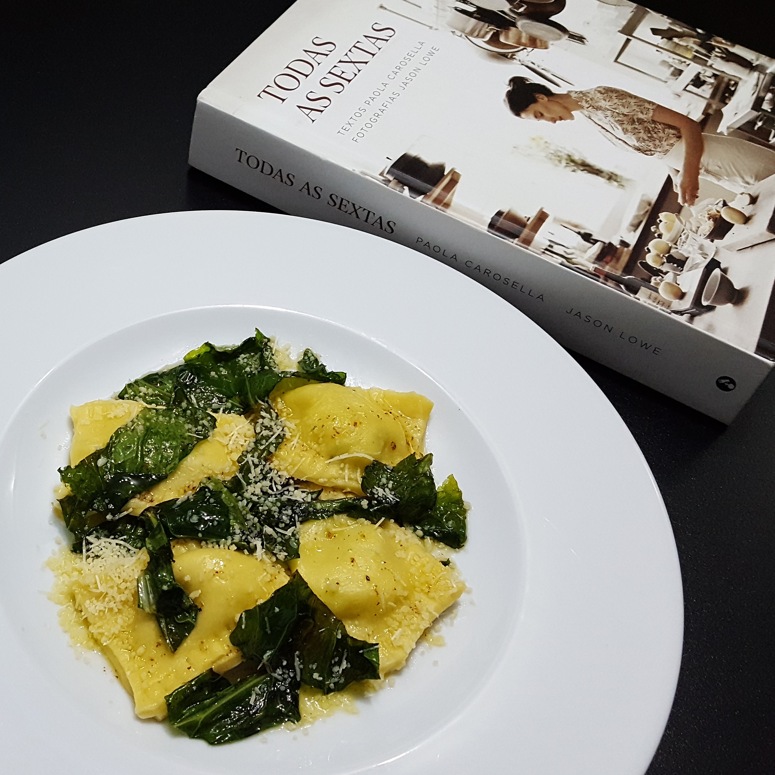 Sexta-feira, dia do projeto “Gratidão de todas as sextas” – Cozinhar todas as 94 receitas do livro “Todas as sextas”, de @paolacarosella (Esse projeto tem um porque, clique aqui e leia o post que publiquei dia 11/11/16, explico lá tudo com todo meu coração). Receita 35/94: Massa branca para pasta. Receita 36/94: Ravióli de abobrinhas. Fazer massa fresca em casa sempre será pra mim revolucionário, corajoso e marcante. Ir atrás de ingredientes dignos, separar, amassar, esperar descansar, abrir, cortar, montar e cozinhar – Executar com suas mãos todos esses verbos e usar seu tempo para construir essa experiência artesanal e mágica, ao invés de comprar pronto no mercado e pular toda essa parte, é de fato revolucionário, hoje em dia. Dizem que tempo é dinheiro, mas como li outro dia e me emocionei lendo: “Isso é uma monstruosidade, o tempo não é dinheiro, o tempo é o tecido de nossas vidas”. Fazer massa fresca em casa é ter uma experiência diferente de tempo, de pensar sobre o tempo e o que temos feitos com o nosso (Que marcas costuro no tecido da minha vida?). Se tem um conselho que eu possa te dar é: Tire um dia de folga, antes de morrer, e faça massa fresca em casa. Isso movimenta algo na gente. E esse recheio de abobrinhas queridas, com esse molho de manteiga (que é amor em uma linguagem gordurosa e brilhante), e azeite, e minha fofas folhas de couve. Ave Maria, que alegria comer isso. Sofri super para abrir a massa, com um rolo. A massa poderia ter saido mais fina. Preciso de um cilindro. Estou feliz pra caramba com tudo, no final, afinal. Hoje eu só queria agradecer.