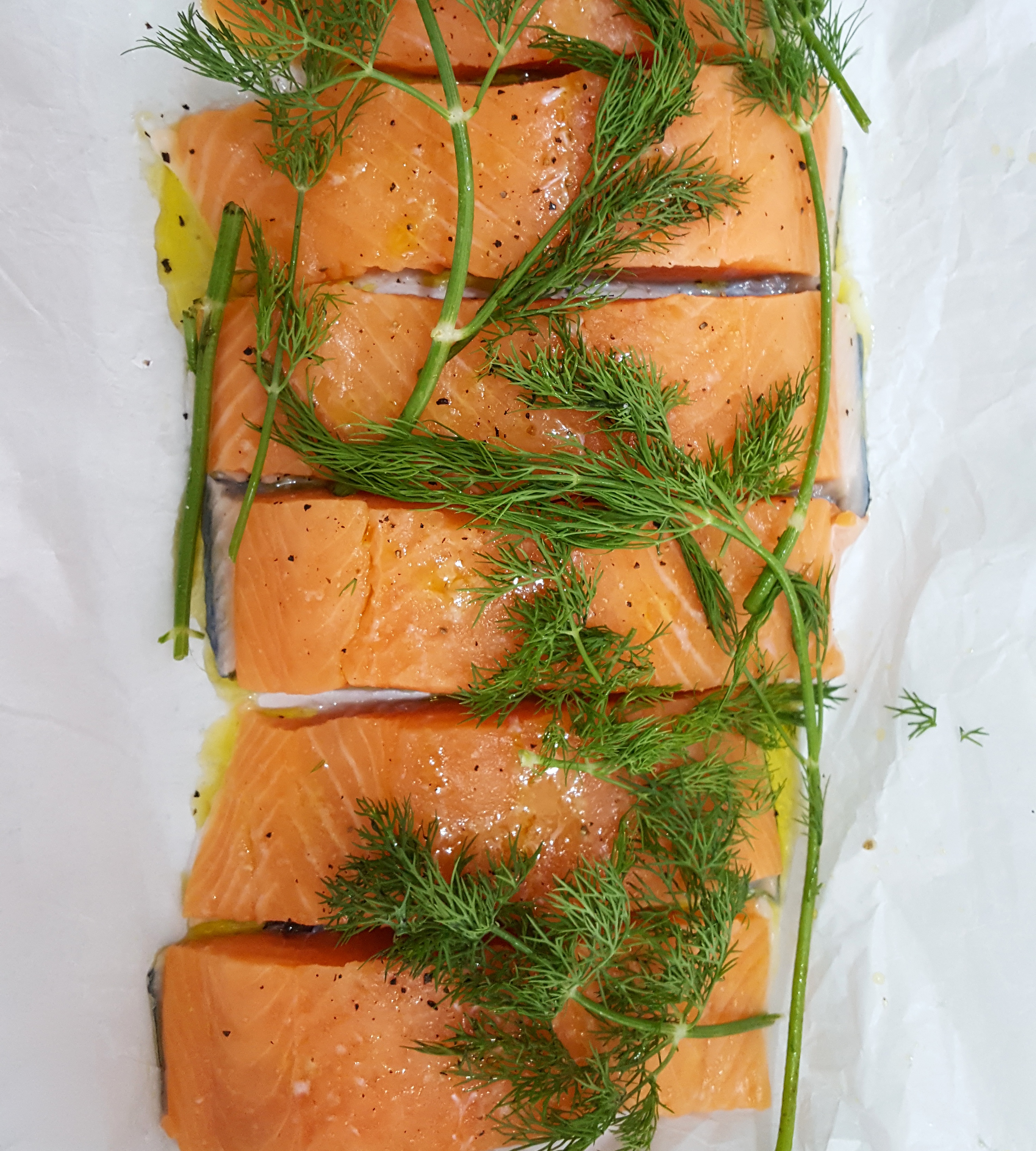 - 1kg de salmão cortado em postas (eu deixo a pele porque ela protege a carne do calor mantendo umidade).