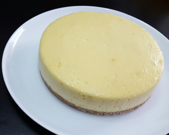Hora de levar para assar, em banho-maria. Pegue uma folha grande de papel alumínio e coloque a forma em cima, rodeando o alumínio em volta dela para proteger e evitar que a água do banho-maria entre na fôrma (já que ela é de fundo removível, né). Coloque então a fôrma com a cheesecake em uma fôrma maior que ela e acrescente água já quente, até cobrir metade da fôrma da cheesecake. Leve para assar no forno pré-aquecido por cerca de 45 minutos à 1 hora. O ponto é quanto você chachoalha um pouco o forno e a cheesecake está bem firme nas bordas e firme/meio não tão firme no centro. Não pode pegar cor nenhuma, o aspecto é esse ó: