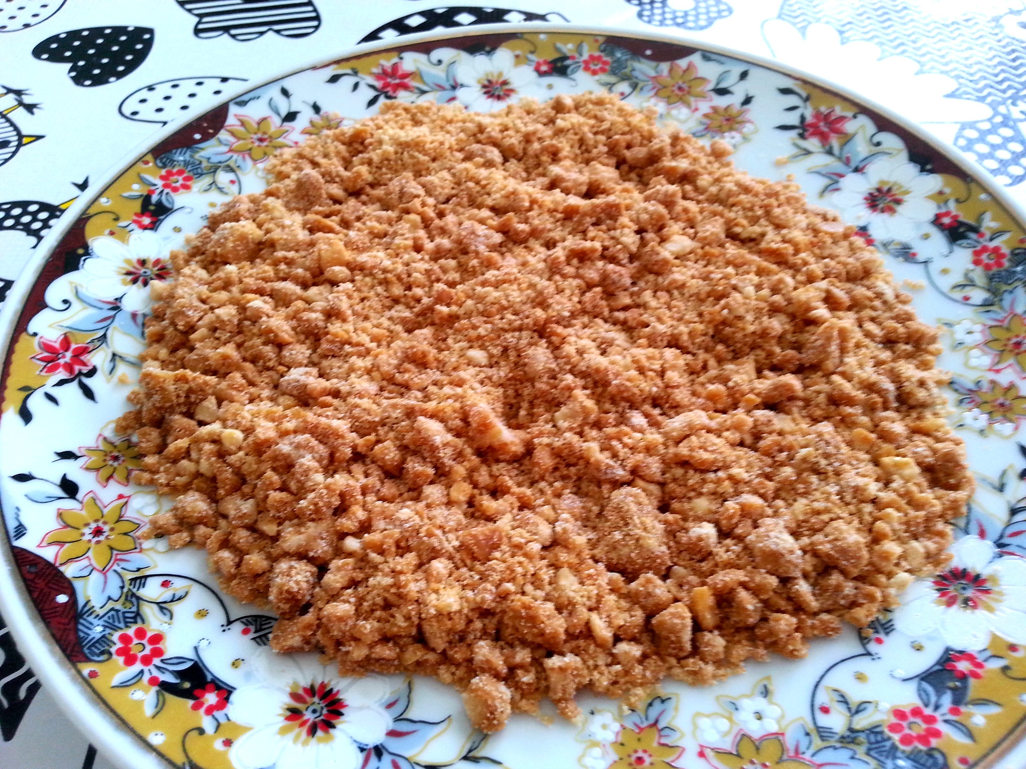 Agora você vai deixar esfriar completamente. Depois que esfriar desprenda o bloco de caramelo da superfície, quebre em algumas partes e coloque dentro de um saco plástico resistente, acrescente dentro do saco o leite em pó e feche. Use um martelo (ou qualquer objetivo pesado que sirva) para bater no saco, triturando o caramelo e criando a nossa linda farofinha. Depois que estiver tudo em pedaços pequenos e com aspecto de farofinha, está pronto para usar!