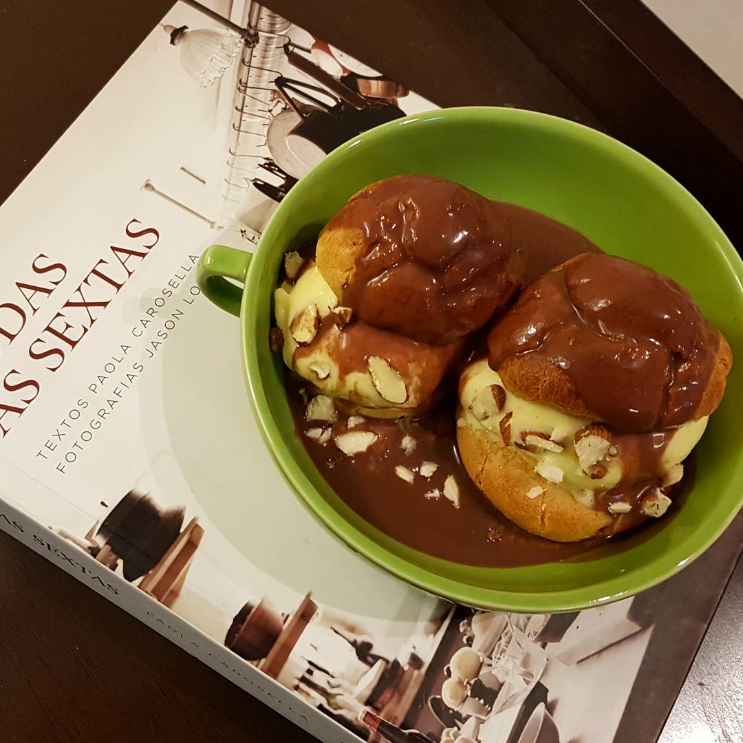 Gratidão de todas as sextas. Cozinhando as 94 receitas do livro “Todas as sextas”, de Paola Carosella. Receita 62/94: Sorvete de baunilha. Receita 63/94: Calda de chocolate. Receita 64/94: Profiteroles recheados de sorvete de baunilha com praliné e calda de chocolate.