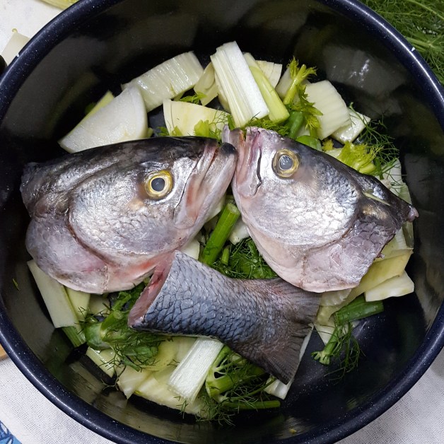 É realmente muito lindo usar tudo do animal. Às vezes acho que é o mínimo que podemos fazer para dar à eles o destino mais digno possível. Em uma panela coloque ervas e alguns legumes que você goste (eu gosto aqui de erva-doce, alho-poró e cebola branca), coloque um pouco de sal e acomode com respeito e carinho a cabeça e o rabo de um peixe fresco. Coloque água, leve ao fogo e quando ferver cozinhe por 25 minutos em fogo baixo. Depois é só coar para ter um caldo maravilhoso de sabor lindo – bom para tantas receitas, como risotto, cozimento de peixes e outras carnes, sopas, enfim. Sempre antes de jogar algo fora se pergunte se aquilo não pode virar algo bom, sua vida muda quando você olha para as coisas assim. As coisas podem ser boas da cabeça até o rabo, eu realmente acho. Paola Carosella também acha e acho que ela tem me inspirado a achar ainda mais. Enfim. Leiam “Todas as sextas”.