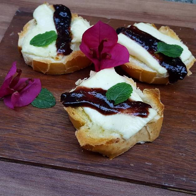 Pegue as fatias de pão, regue generosamente com azeite, coloque queijo branco e leve ao forno até dourar e o queijo amolecer. Tire e coloque um doce de fruta (pode ser qualquer doce/geleia de fruta que você tenha algum carinho, aqui eu usei uma de calafate (uma frutinha da Patagônia). Coloque folhinhas de hortelã, dá um frescor gentil. O azeite é importante pra dar umidade (visto que o queijo branco sozinho não faz isso) e o aroma do azeite fica ótimo com o doce de fruta. Escolha um bom, isso importa.Seja muito feliz comendo.