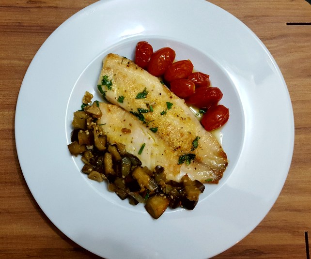 Essa é uma refeição rápida, mas uma refeição rápida com alma, fica boa mesmo, porque os preparos são em sua essência rápidos de verdade (não são aquelas receitas rápidas que encurtam sem respeito o tempo certo que as coisas precisam para ficar prontas). Você não precisa sempre ter duas horas para cozinhar para comer bem, com afeto e verdade. Adoro um peixe fresco, com algo cítrico acompanhado de tomates confitados, é um dos meus jeitos mais felizes de comer um filé de peixe. A berinjela é uma convidada muito querida nesse prato, é um carinho tê-la junto aqui. Para fazer tudo isso precisei só de uns 30 minutos e de uma música que deixou meus movimentos mais harmônicos e alegres, tipo “I wanna dance with somebody”, da Whitney Houston. É bom, muito bom.