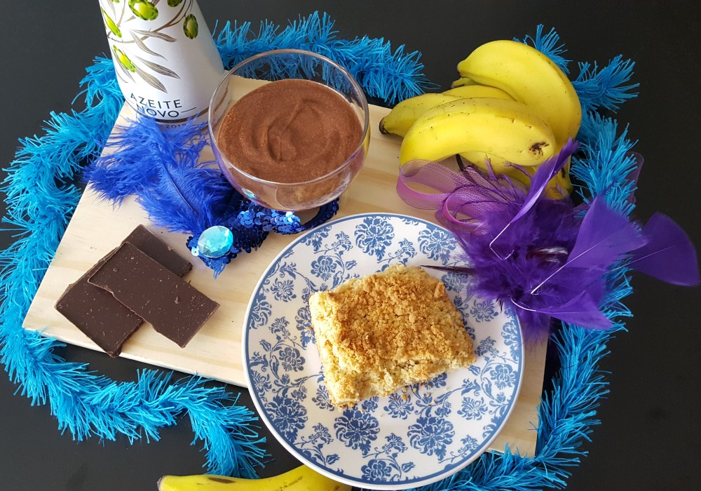 É fevereiro, tem carnaval, mas também tem ressaca, e eu estou aqui para te ajudar a sambar na cara dela. Sabia que existem alimentos que ajudam à combatê-la e devolvem sua alegria carnavalesca? Pois eu decidi dar pra vocês um presente de carnaval: 2 receitas desblonde que ajudam a combater a ressaca com muita elegância: Cuca alemã de banana e mousse francesa de chocolate, em uma edição especial com um toque de azeite de oliva extravirgem – o excesso de bebedeira diminui o potássio do organismo e a banana, gentilmente, ajuda na reposição. O chocolate (assim como doces no geral) ajuda a quebrar aqueles sintomas chatos equilibrando a quantidade de açúcar no sangue. O azeite ressalta lindamente essas duas receitas – e aliás, você sabia que tomar uma colher de azeite antes de beber diminui o ritmo de absorção do álcool? Pois é. Claro que você tem que se hidratar e tomar outros cuidados, as receitinhas são só um jeito carinhoso de repor no seu organismo algumas coisinhas que ele perdeu na folia. Enfim, nesse carnaval, adocica sua vida, meu amor, adocica…