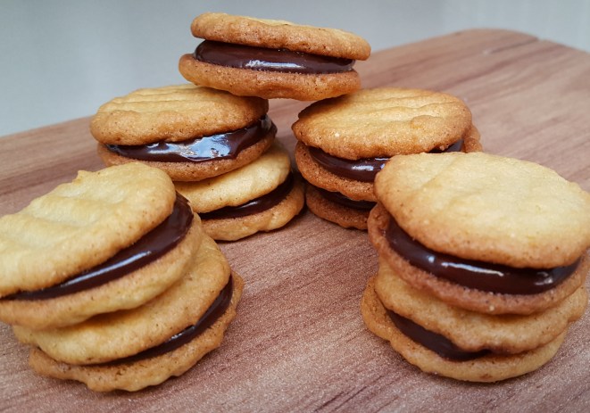 Essa é uma receita gentil e alegre, para fazer em uma tarde sutil, mas também serve para outros horários do dia. Aprendi ela em um livro canadense incrível que tem receitas emocionantes dos mais lindos cookies norte-americanos. Essa receita é realmente simples e boa, a magia dela está na massa do biscoito ser feita com manteiga de amendoim (fica uma coisa linda e boa de Deus). Esse biscoitinho com um recheio úmido de chocolate é tão envolvente que chega a ser quase sensual, socorro. Tenho um carinho por qualquer receita de cookie, sempre os faço muito feliz e calmo, então compartilho a receita carinhosamente com vocês. E ah, essa é uma opção maravilhosa, viva e honesta para você substituir por aqueles biscoitos recheados que vendem por aí, aqueles que 99% é elemento industrial estranho e só aquele 1% é biscoito mesmo. Fazer em casa é glorioso e libertador, tenta. Não esqueça de se divertir enquanto faz, é importante.