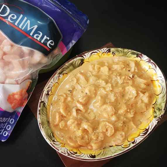 Acordei hoje muito marítimo querendo cozinhar coisas de mar. A luz do dia hoje às 9:14 (quando acordei) tava linda, olhei pra minha cozinha e já coloquei uma música nela e ali fiquei, com uma energia muito generosa e boa – que às vezes só acho na cozinha. Enfim, era um clima perfeito para um strogonoff de camarão, e eu tinha esses da DellMare , uma empresa com produtos muito bacanas, bem cuidados e práticos. Eles também tem embalagens super modernas, transparentes (você consegue ver o produto que vai comprar) e com zip (você usa e se sobrar fecha direitinho e guarda de novo). Além de camarões, eles tem kit para preparo de paella (em breve faço esse ❤), anéis de lula, Saint-Peter e outros. Esse strogonoff é super simples! Dá uma olhada: