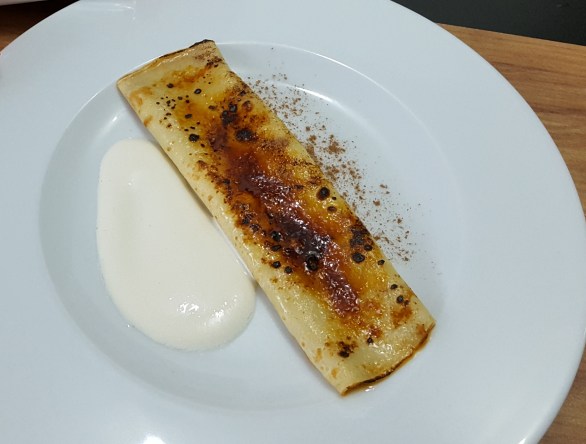 Logo pós terminar de fritar a massa, recheie ela com doce de leite (com um bom, se souber fazer em casa faça, se não compre um de quem faça com verdade e qualidade) e enrole (sem colocar muito para não vazar). Coloque em um prato com a parte lisa do crepe para cima. Faça uma fina camada de açúcar e “queime” com um maçarico, fazendo movimentos circulares até caramelizar e criar uma casquinha (sem queimar demais para não amargar). Se você não tem maçarico, pode fazer o brûlée da seguinte forma: Esquente uma colher de metal (uma que você não goste, pois ficará manchada) na chama do seu fogão a gás até ficar bem quente (o metal ficará num tom azul e meio escurecido). Após aquecer encoste a colher no açúcar e faça movimentos circulares, até caramelizar toda a superfície. Antes de aquecer a colher novamente lave-a muito bem para não ficar resíduos.