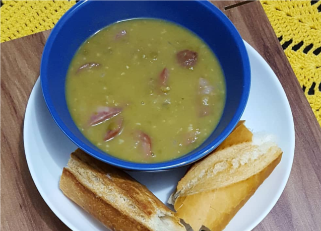 Essa sopa de ervilha eu fiz ontem – ela me deu de presente uma sexta-feira quente, boa, aconchegante e carinhosa, com sabor e afeto, e eu só precisei de 30 minutos pra fazer ela. Sempre faço ela quando estou cansado ou com pouco tempo em um dia frio. Juro que é boa e quero te contar a receita: