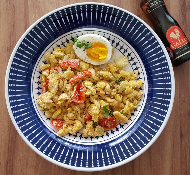 Refogue a cebola com uma pitada de sal na manteiga e no azeite , acrescente o alho até ele fritar, então coloquei tomate-cereja cortado ao meio e pimentão vermelho. Refogue. Coloque os ovos e mexa sem parar – para que eles cozinhem se unindo a cremosidade da manteiga. Então, antes do ovo ficar seco, coloque a farinha de mandioca e mexa, torrando sutilmente a farinha. Tempere com sal, pimenta e zathar. Finalize com coentro picado. Pronto. Nas quantidades seja intuitivo, é bom à vezes. Veja se sente vontade de colocar menos ou mais algum elemento. Dá certo. Tem mil jeitos de fazer farofa de ovos. Não precisa fazer exatamente essa, inventa uma e me conta, vai ser legal.