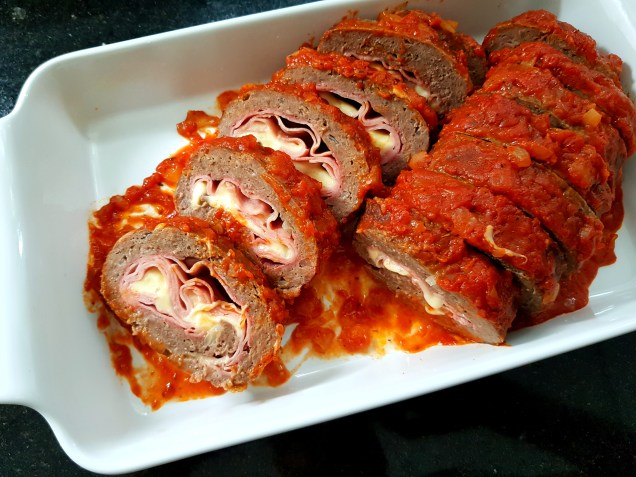 Com a ajuda do papel alumínio, vá fechando o rocambole, enrolando e cuidando para que o recheio vá ficando dentro. No final, una as partes da carne para grudar um lado no outro e fechar o rocambole. Com seus dedos, feche toda abertura, modelando bem para evitar que abra (é normal que vaze um pouco do recheio quando assar, mas quanto melhor você fechar mais garantia terá de que o recheio ficará dentro.