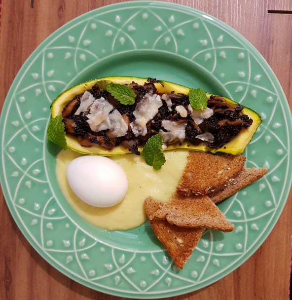 Sirva a abobrinha recheada com folhas de hortelã, com o creme, uma torrada e um ovo cozido por 6 minutos. Sente pra comer ouvindo ainda uma música calma com som de violão. Descanse do seu dia complexo na leveza desse prato. Agradeça alguma coisa, pode ser por existir abobrinhas. Fique em paz.
