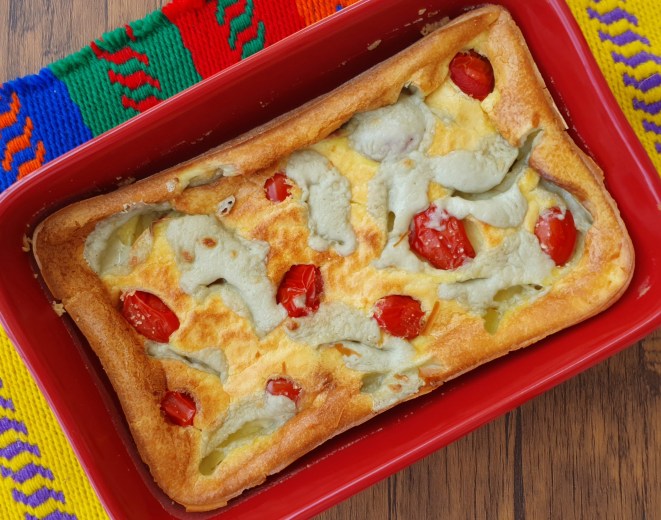 Clafoutis de queijos e tomate – ontem falamos sobre a versão doce desse preparo francês aconchegante (comida de casa de vó francesa), e hoje a gente aprende a versão salgada – onde troca-se a fruta por tomates e o açúcar por queijo e voilà. Desses preparos simples e charmosos, que a gente ama. Olha como faço: