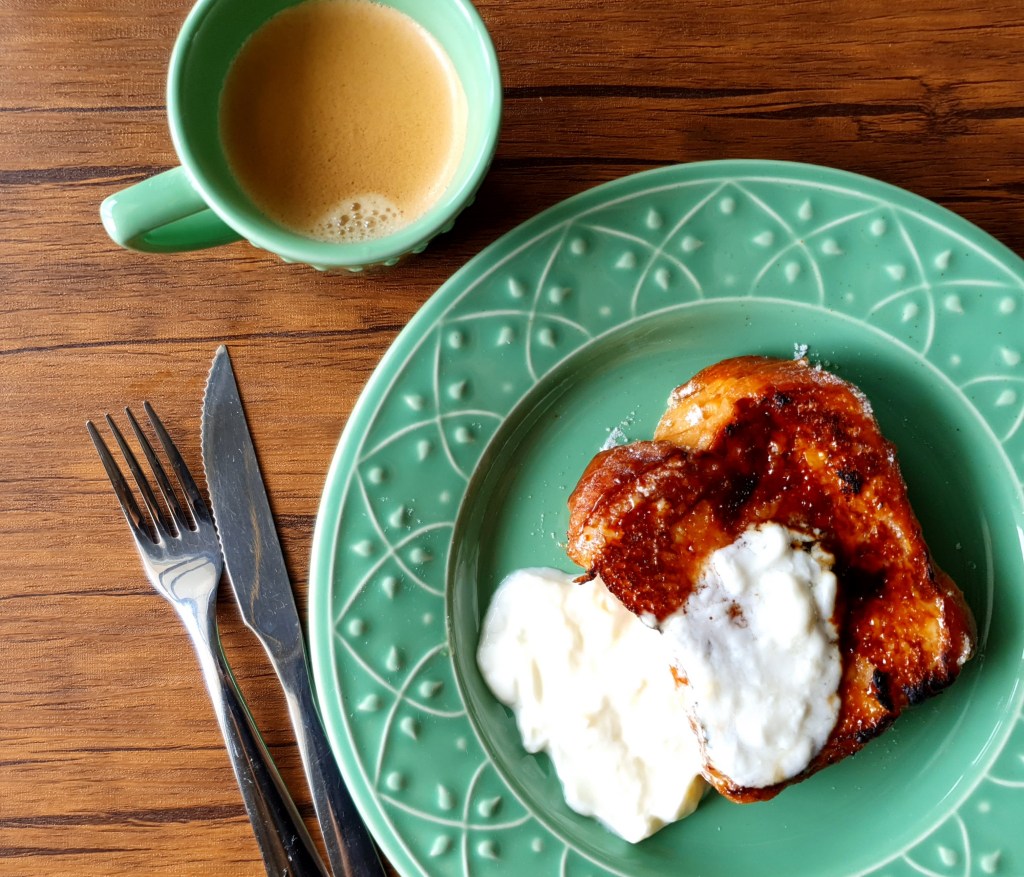 Rabanada brûlée, que também se chama Brioche French Toast ou Pain Perdu. A versão com casquinha de caramelo pode ser feita em casa com uma colher quente ou com maçarico. Bruletizada ou normal, é tiro certo pra uma tarde que tenha alguma forma de encanto.
