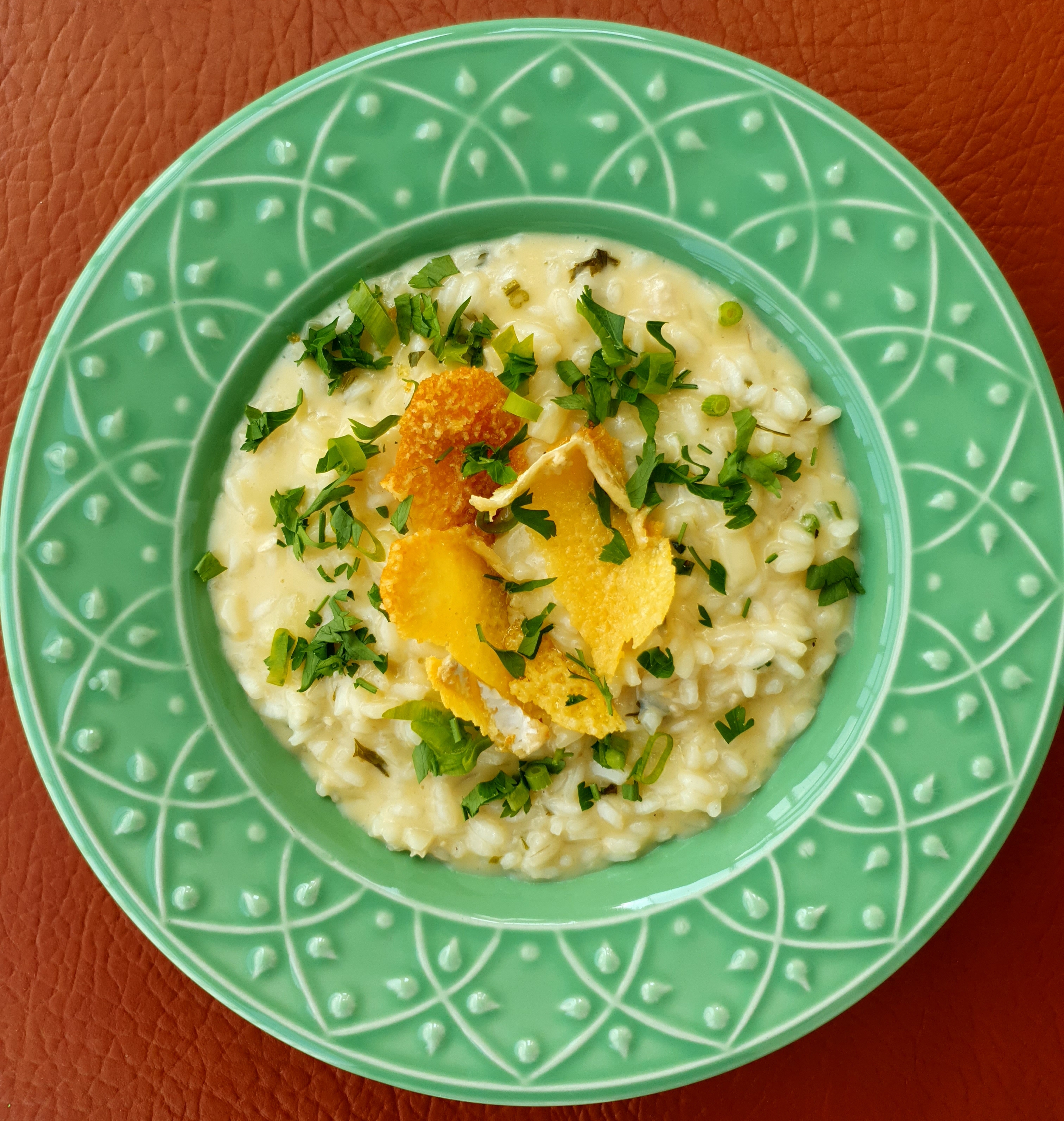 Sirva o risoto finalizando com ervas frescas picadas e o crocante de brie. Mas que gracinha.