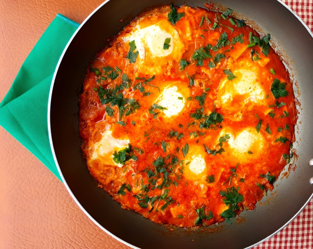 Em uma panela ou frigideira coloque azeite e refogue um pouco de cebola picada, em seguida junte um pouco de alho esmagado e deixe fritar um tico. Acrescente uns tomates picados, refogue. Junte um tanto de extrato de tomate e um pouco de água. Tempere com sal, pimenta-do-reino, páprica defumada, cominho, pimenta chili… ou quais outros você quiser. Deixe ferver uns instantes. Você precisa de um molho de tomate encorpado mas não tão grosso. Então espalhe no molho cubos de qualquer queijo fresco e em seguida coloque os ovos, acomodando cada um em um canto, de modo que fiquem um pouco espaçados. Não mexa mais a panela depois que colocar os ovos. Em fogo baixo, deixe cozinhar sem tampa 2 minutos e depois tampe, e cozinhe até os ovos atingirem o ponto que você ame. Finalize com ervas. Aproveite.