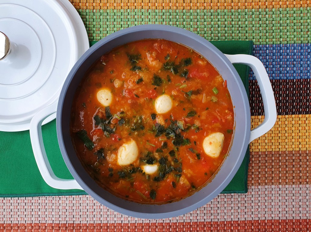 Aqueço uma panela e coloco azeite, junto cebola picada e refogo ela só um instante e junto alho (fresco cortado em lâminas), deixo refogar – mas sem dourar (se doura muda o sabor e esses detalhes importam). Junto então os tomates, picados, e tempero com: sal, pimenta (preta, caiena, ou dedo de moça), páprica doce e defumada (muita, uma orgia de pápricas) e cominho em pó. Cozinho na panela tampada até o tomate se desfazer e virar um purê com pedaços. Ajusto com água se precisar pra que seja de fato um caldo e junto migalhas de pão amanhecido. Deixo tudo cozinhar uns minutos para que o pão seja parte do caldo e desligo a panela, então coloco pedaços de algum queijo fresco (pode ser mozzarella de búfala, também fica ótimo com queijo minas). Finalizo com coentro ou manjericão fresco, e fios de algum azeite bem perfumado.