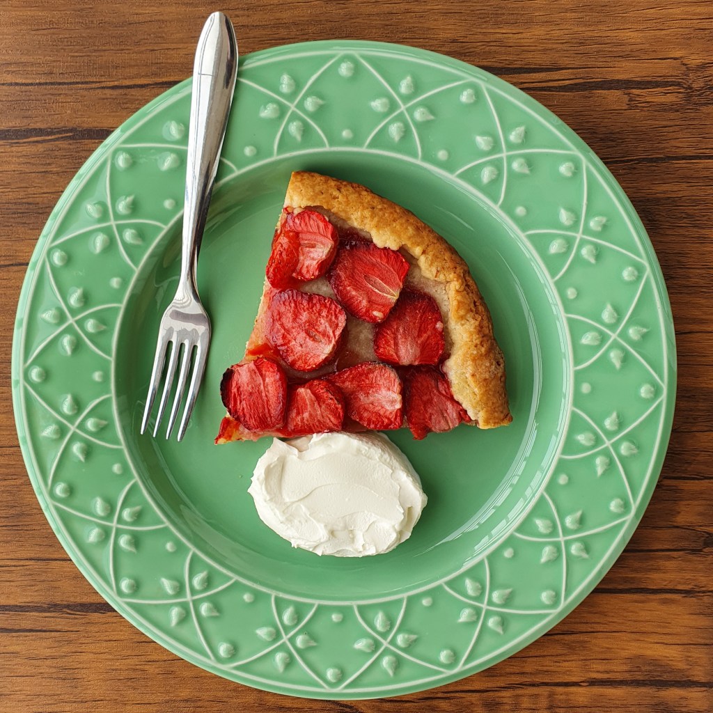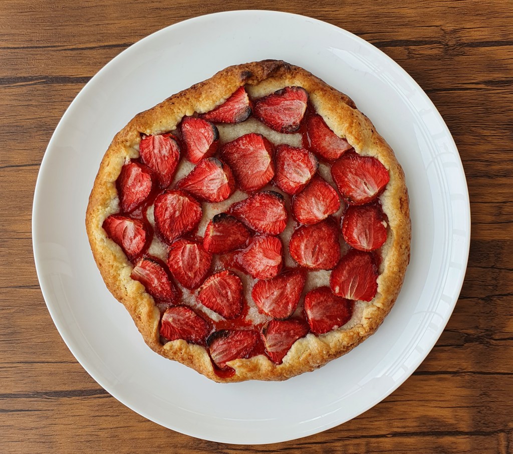 Galette de morangos – uma torta francesa rústica, aberta, simples – ela dá pra gente mais do que a gente espera dela (entendemos isso na primeira garfada, quando flutuamos através de um prazer gentil para algum strawberry fields forever que existe dentro da gente).