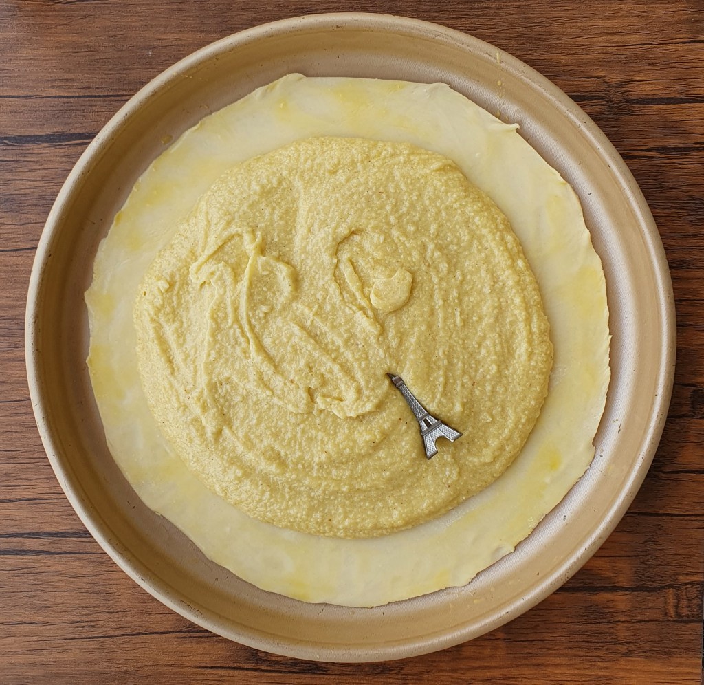 3. Abra uma folha de massa folhada (de umas 250g) e corte num formato redondo. Coloque o frangipane todo no centro. Bata 1 ovo e pincela as bordas. Se for seguir a tradição: coloque um objeto gracioso em uma das laterais do círculo.