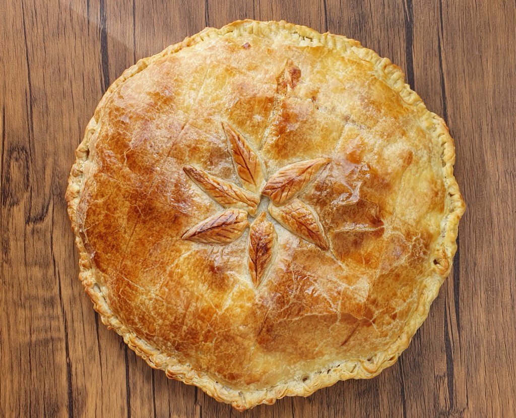 4. Cubra com outra folha de massa folhada (também de umas 250g) do mesmo formato. Aperte com um garfo as bordas para fechar bem. Ajeito as bordas fazendo dobrinhas fofas para cima. Decore como quiser (fiz uns riscos na massa sem cortar ela e folhinhas com as sobras). Pincele tudo com o ovo batido.