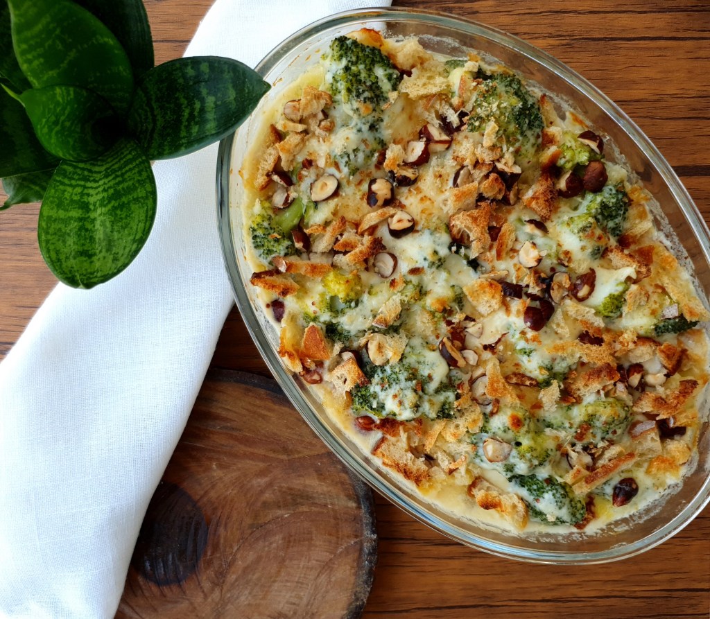 3) Misture o brócolis cozido com o molho e disponha tudo em uma travessa. Coloque por cima queijo ralado, avelãs quebradas em pedaços e migalhas de pão.