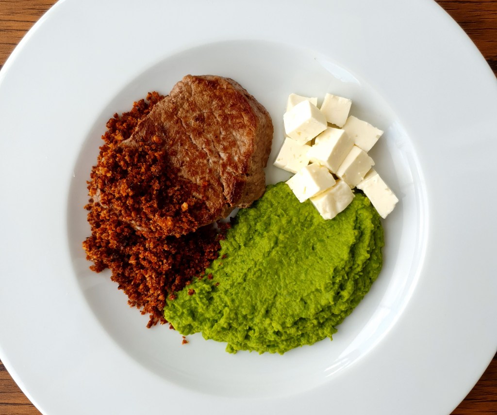 A força da carne vermelha, com a doçura do purê de ervilhas e o crocante provocativo da farofa é contornado muito bem por um queijo fresco do lado – aqui usei o Minas Frescal.