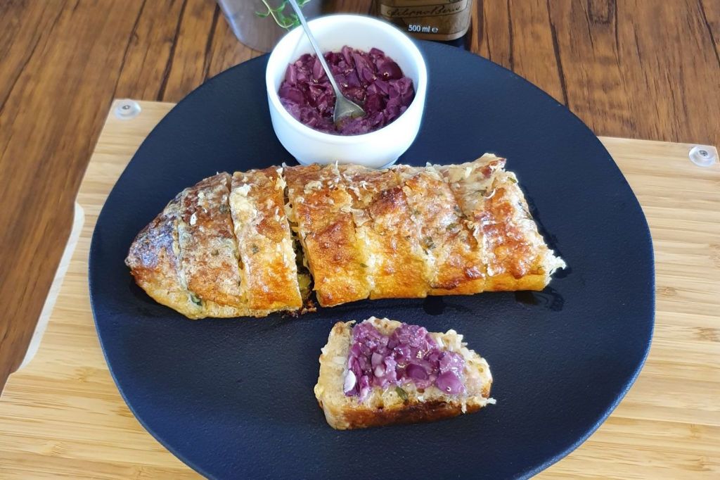 Gosto de servir com um antepasto de azeitonas, que faço assim: tiro o caroço, pico e esmago umas 23 azeitonas pretas, adiciono 2 colheres de chá de mel, 2 de vinagre de maçã, meio dente de alho picado e tempero com pimenta, coloco fios de azeite e pronto.