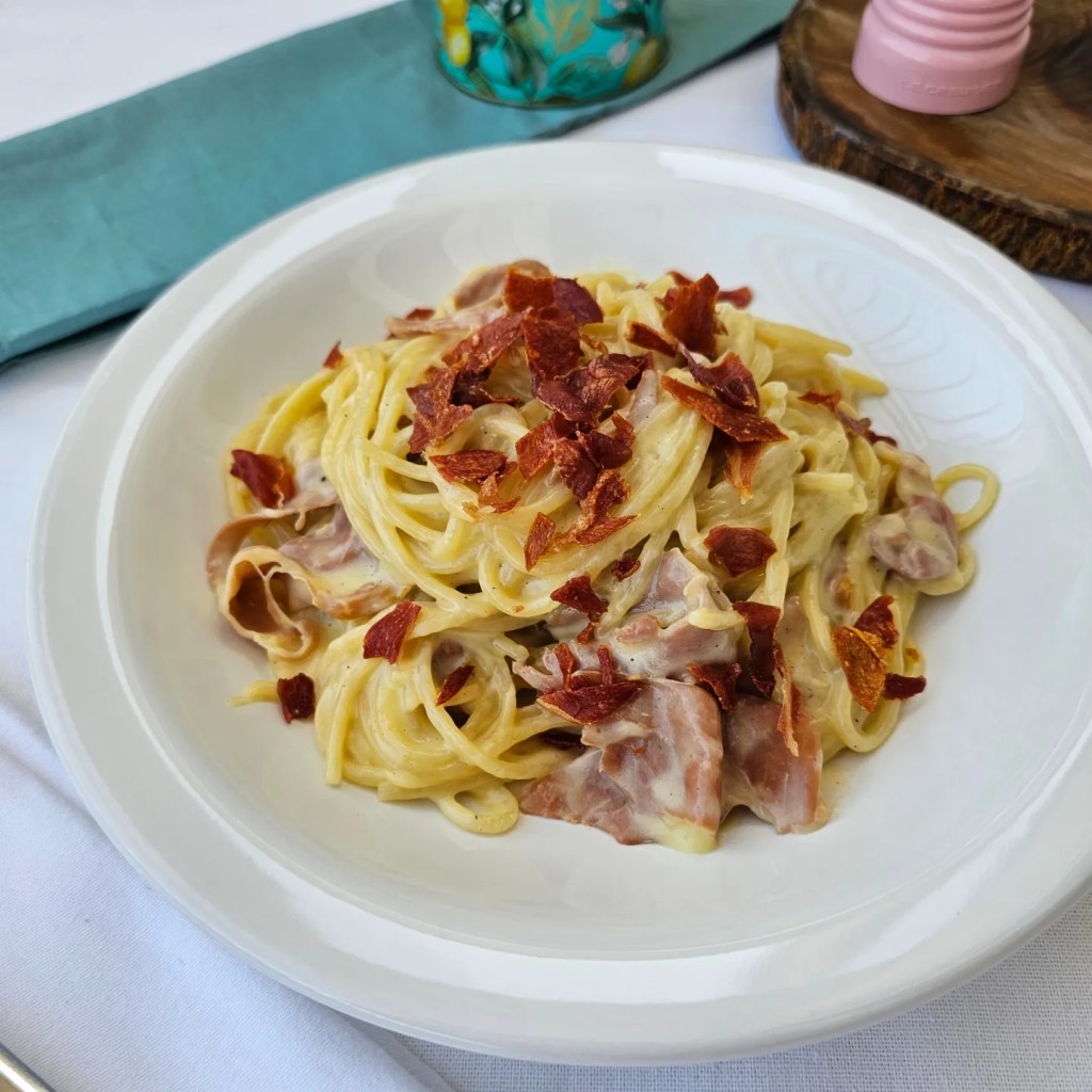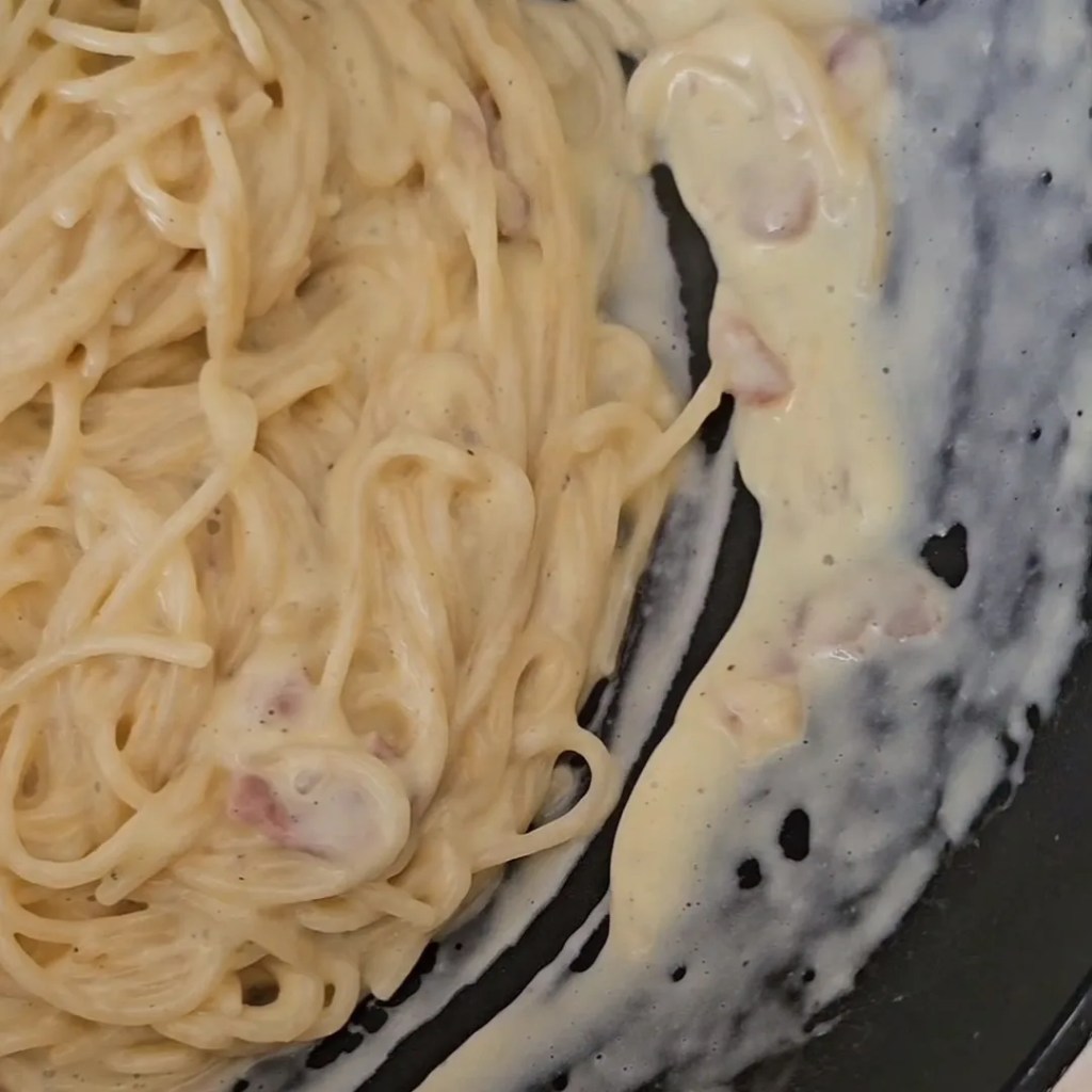 4) Assim que o macarrão chegar no ponto que você goste (mas não deixe cozinhar demais) transfira ele para a panela com o presunto e coloque 2 conchas da água do cozimento. Misture tudo por 30 segundos em fogo alto. Desligue o fogo, adicione a mistura de ovos e mexa bem rapidamente, até formar um molho cremoso – se ficar muito líquido depois de uns 20 segundos mexendo, ligue o fogo baixo por uns 10 segundos para trazer mais calor e ajudar a engrossar o molho. Se ficar muito grosso, coloque mais um tiquinho da água do cozimento.