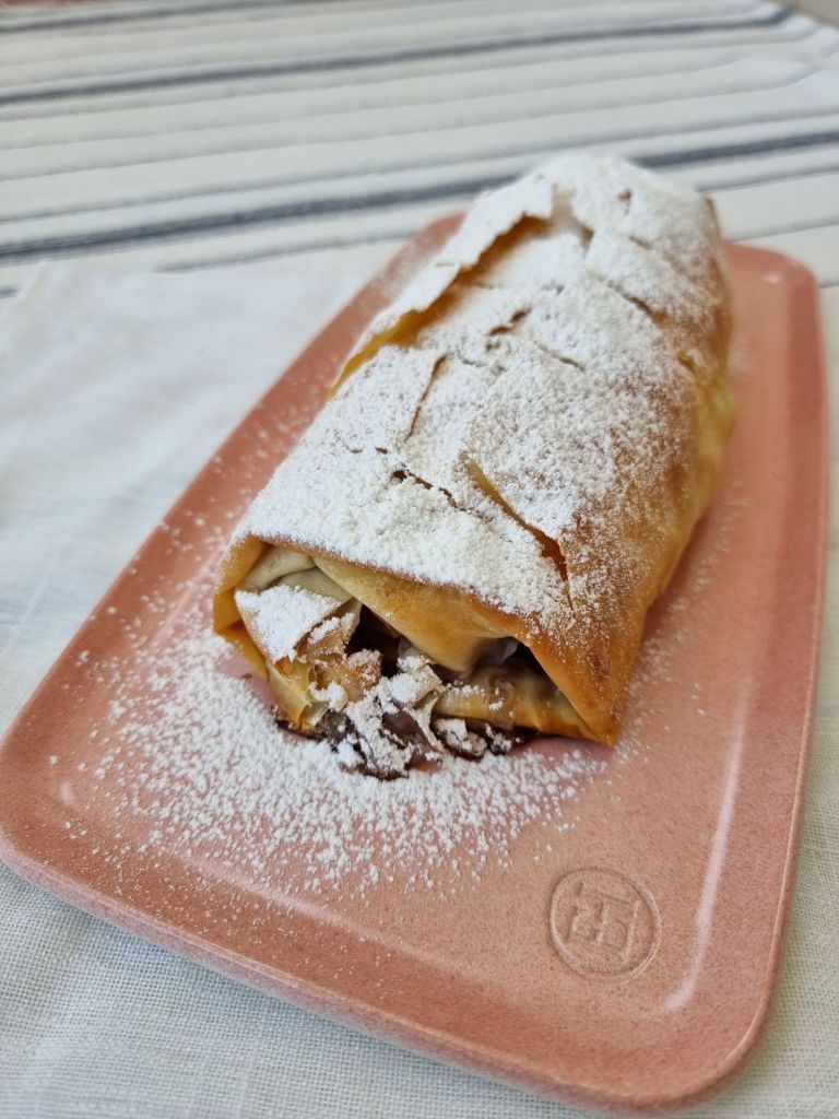 Strudel de maçã ou Apfelstrudel – uma sobremesa tradicional austríaca que consiste em uma massa folhada com recheio de maçã. Crocante e macia, simples de fazer e acolhedora – como qualquer sobremesa com maçã deve ser. Me dá algo bom fazer e comer isso, nunca pensei muito bem porque, e não vou pensar hoje pra tentar explicar, vou só ensinar a receita mesmo (nem sempre é hora de explicar uma beleza que a gente sente, às vezes deixar ela não dita – como uma música clássica que é bela mas não tem voz – é melhor).