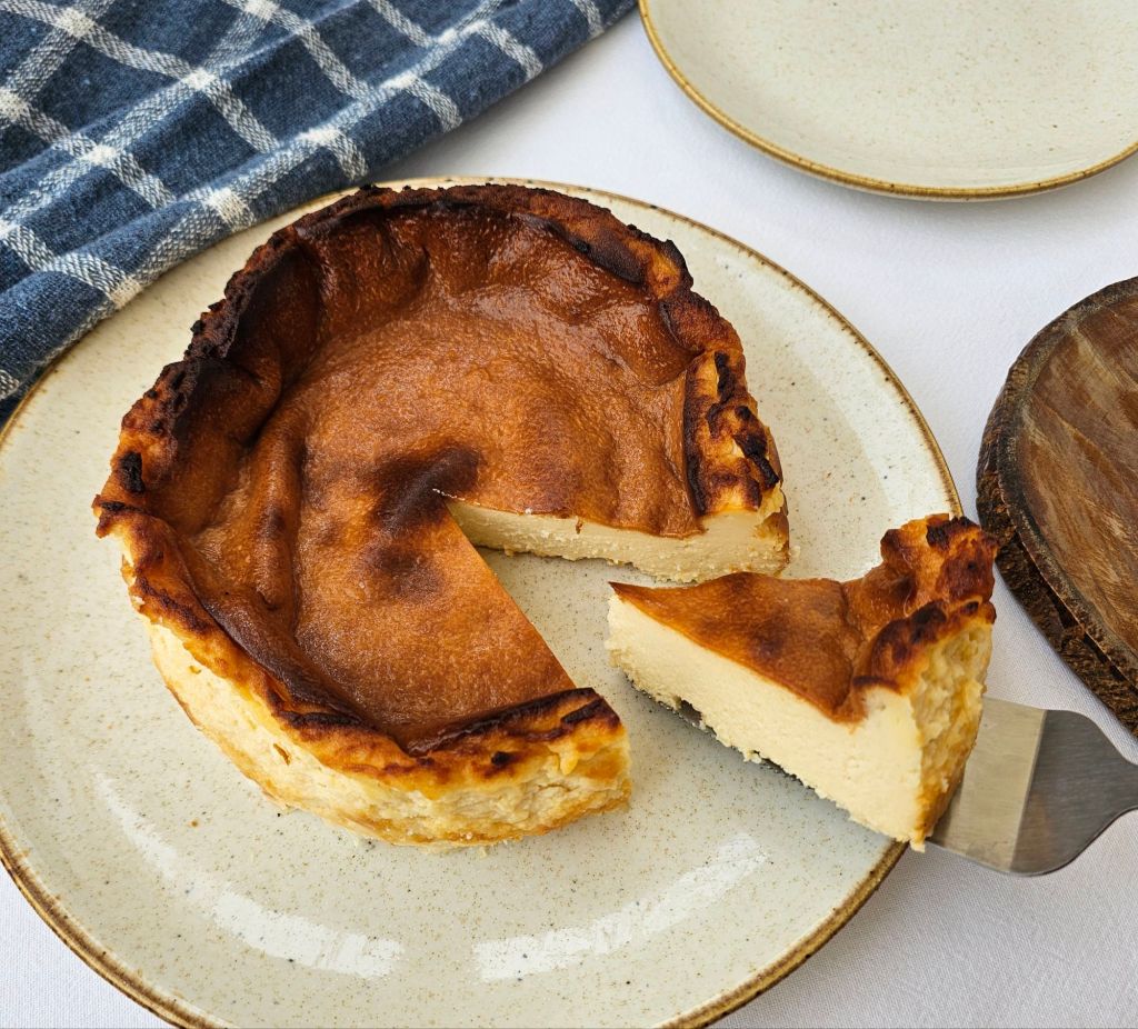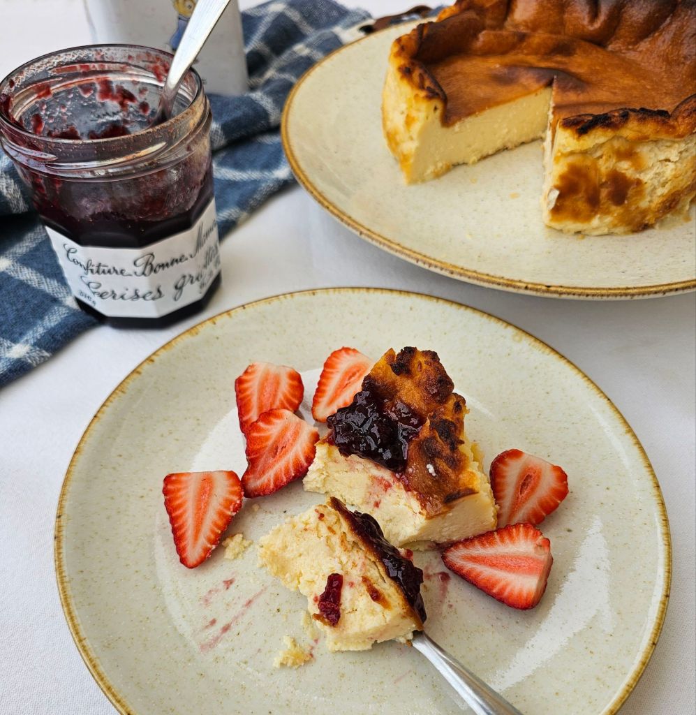 Cheesecake basco – tem como característica mais marcante essa superfície dourada (não queimou não, é isso mesmo, fique em paz e tema menos a intensidade de alguns tostados nessa vida). Essa superfície bem caramelizada contrasta lindamente com o centro macio/cremoso. Deliciosa sozinha ou com geleia, doce de leite, etc. Mais fácil de fazer que cheesecake tradicional, e acho que gostei até mais.