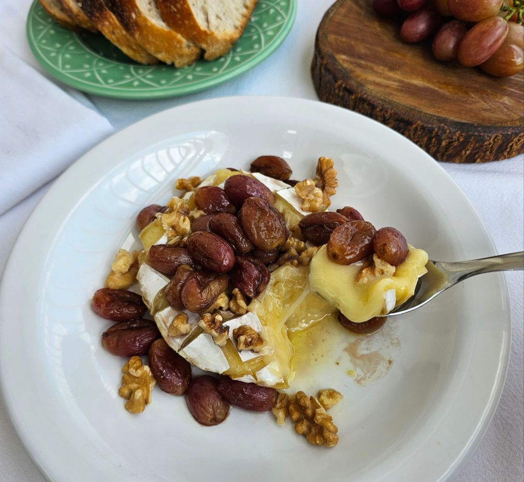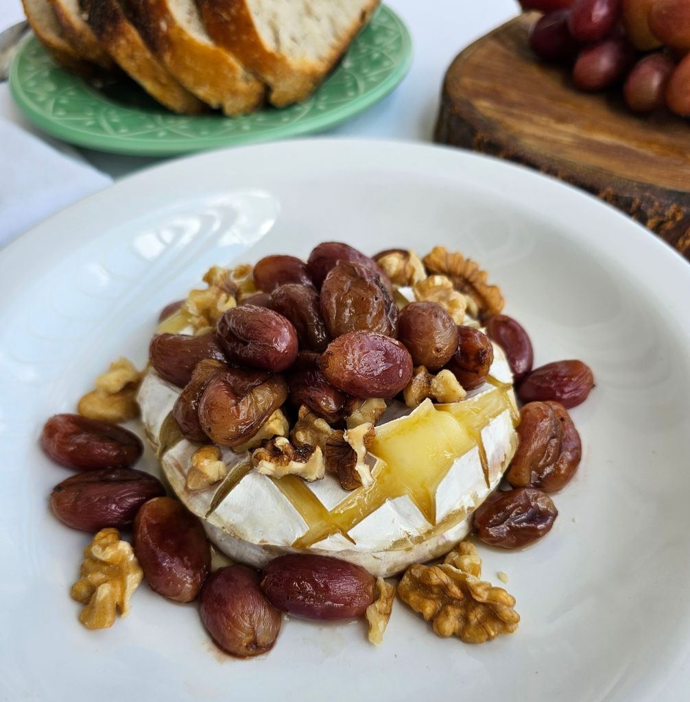 Faça cortes superficiais no queijo, criando um “xadrez”. Lambuze toda a superfície com mel, espalhe nozes por cima e leve ao forno por 10 minutos (para aquecer e mudar a textura). Transfira o queijo com cuidado para onde irá servir, coloque as uvas por cima e sirva com um pãozinho gostoso ou torradas. Mas que gracinha.