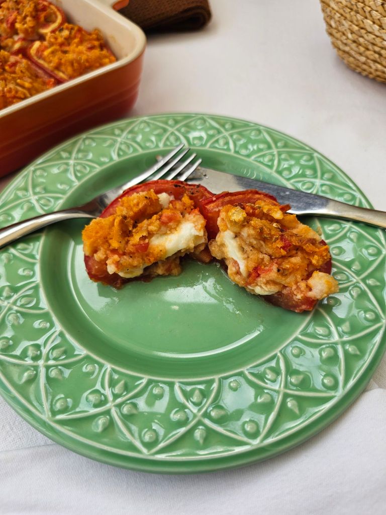 Para o recheio: Pique pão velho e esfarele em uma tigela (também poderia ser farinha de rosca). Junte queijo parmesão, sal, pimenta e azeite. Pique em pedaços pequenos a polpa que tirou dos tomates e vá acrescentando aos poucos, misturando – você precisa de uma textura que seja uma massinha esfarelenta, mas com alguma aderência – ao apertar, ela se junta, mas se você mexer a mão ela já vai esfarelando. Se precisar, coloque mais azeite e polpa ou mais pão picado para atingir esse ponto. Recheie assim: coloque só um pouquinho da mistura em cada metade de tomate. Por cima, coloque um pedaço de algum queijo (usei um de búfala, mas pode ser qualquer um), depois cubra com mais da mistura, dessa vez em maior quantidade. Leve para assar por uns 20 minutos, até dourar levemente. Pronto.